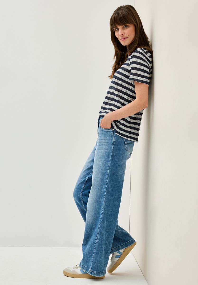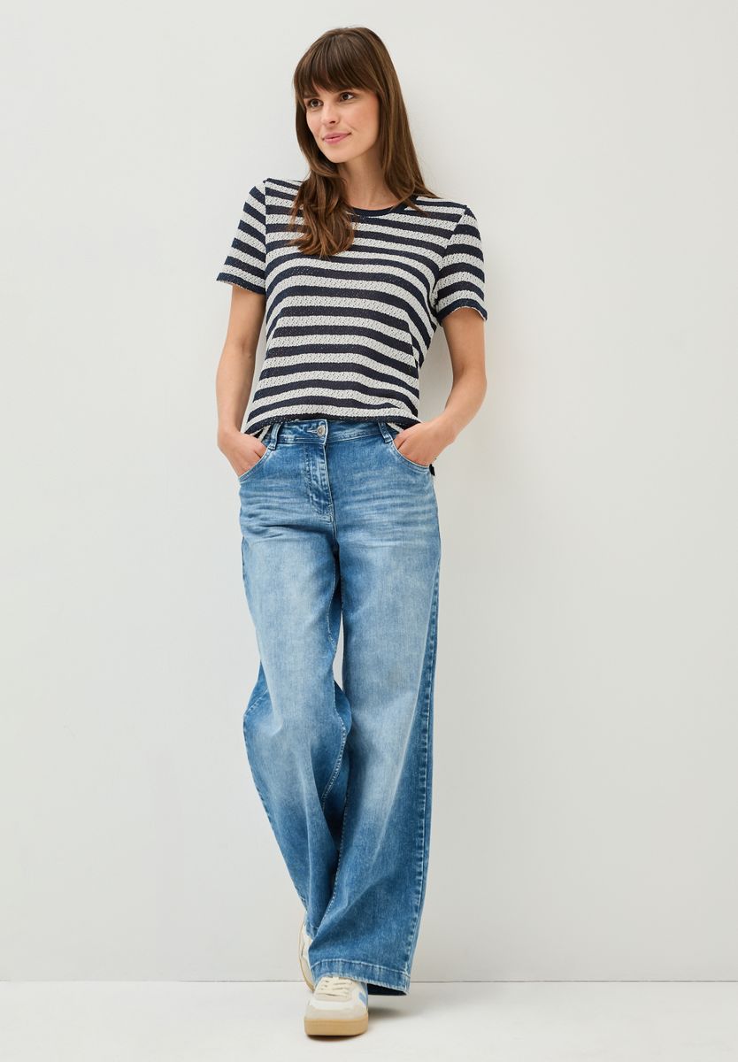 Das Ajour-Shirt von CECIL für Damen ist durch seine Häkeloptik leicht durchscheinend und ideal für sommerliche Outfits mit Layering-Details. Mit Rundhalsausschnitt, kurzen Ärmeln und seitlichen Schlitzen punktet es durch luftigen Komfort. Mit seinem klassischen Streifenmuster ist es ein ideales Sommershirt für warme Tage. Kurzarmshirt Rundhalsausschnitt Seitliche Schlitze Häkel-Optik Leicht durchscheinend Material: 60% Baumwolle, 40% Polyester