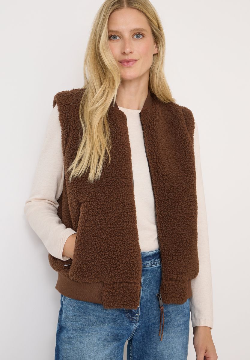 Die Teddy Weste von CECIL für Damen bringt mit ihrer soften Qualität und dem Stehkragen gemütlichen Flair in dein Outfit. Ärmellos und mit seitlichen Zipper-Taschen ausgestattet, eignet sie sich perfekt für stylische Layering-Looks. Ideal für entspannte Tage mit Wohlfühlcharakter. Damenweste Stehkragen Seitliche Taschen mit Zipper Ärmellos Softe Teddy-Qualität Material: Obermaterial: 100% Polyester; Futter: 100% Polyester FARBNR