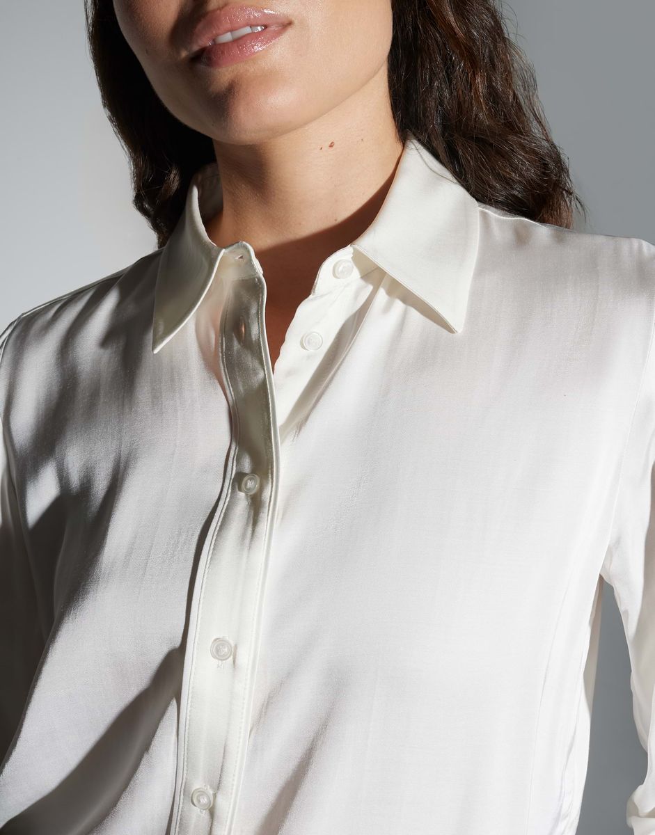 lockere Passform, gerader Schnitt, leicht verkürzt geschnitten, Langarm, Hemdblusenkragen, Rückenlänge ca. 61 cm bei Größe 36, Model Größe 177 cm – trägt Größe 36, Satin, glatter Griff, leichte Transparenz im hellen Farbton, dezenter Schimmer, abgerundeter Saum, Knopfleiste, Passe im Rücken FARBNR