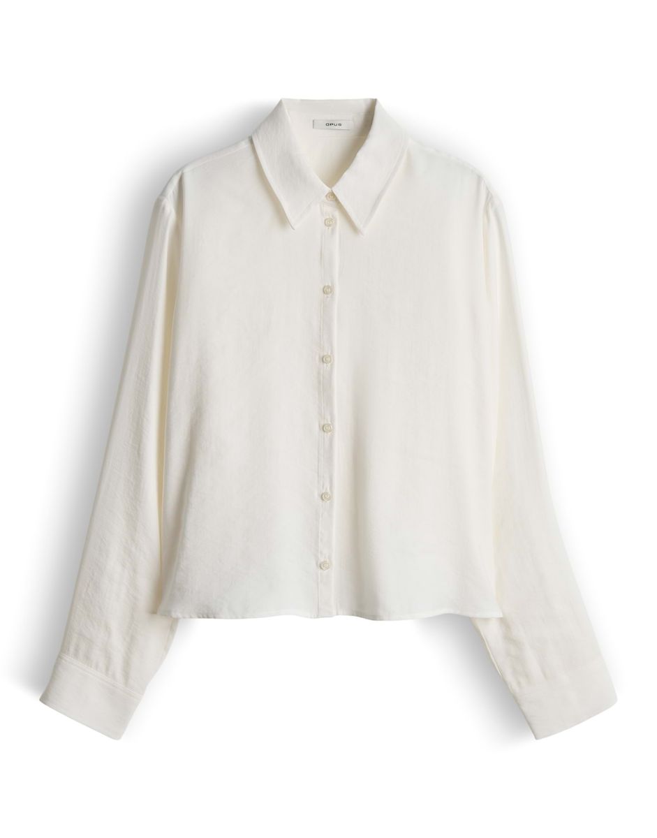 lockere Passform, ausgestellter Schnitt, leicht verkürzter Schnitt, Langarm, Hemdblusenkragen, Rückenlänge ca. 57 cm bei Größe 36, Model Größe 178 cm – trägt Größe 36, Webware, dezente Twillstruktur, weicher Griff, samtige Oberfläche, fließender Fall, leichte Transparenz im hellen Farbton, Kellerfalte im Rücken, Knopfleiste FARBNR