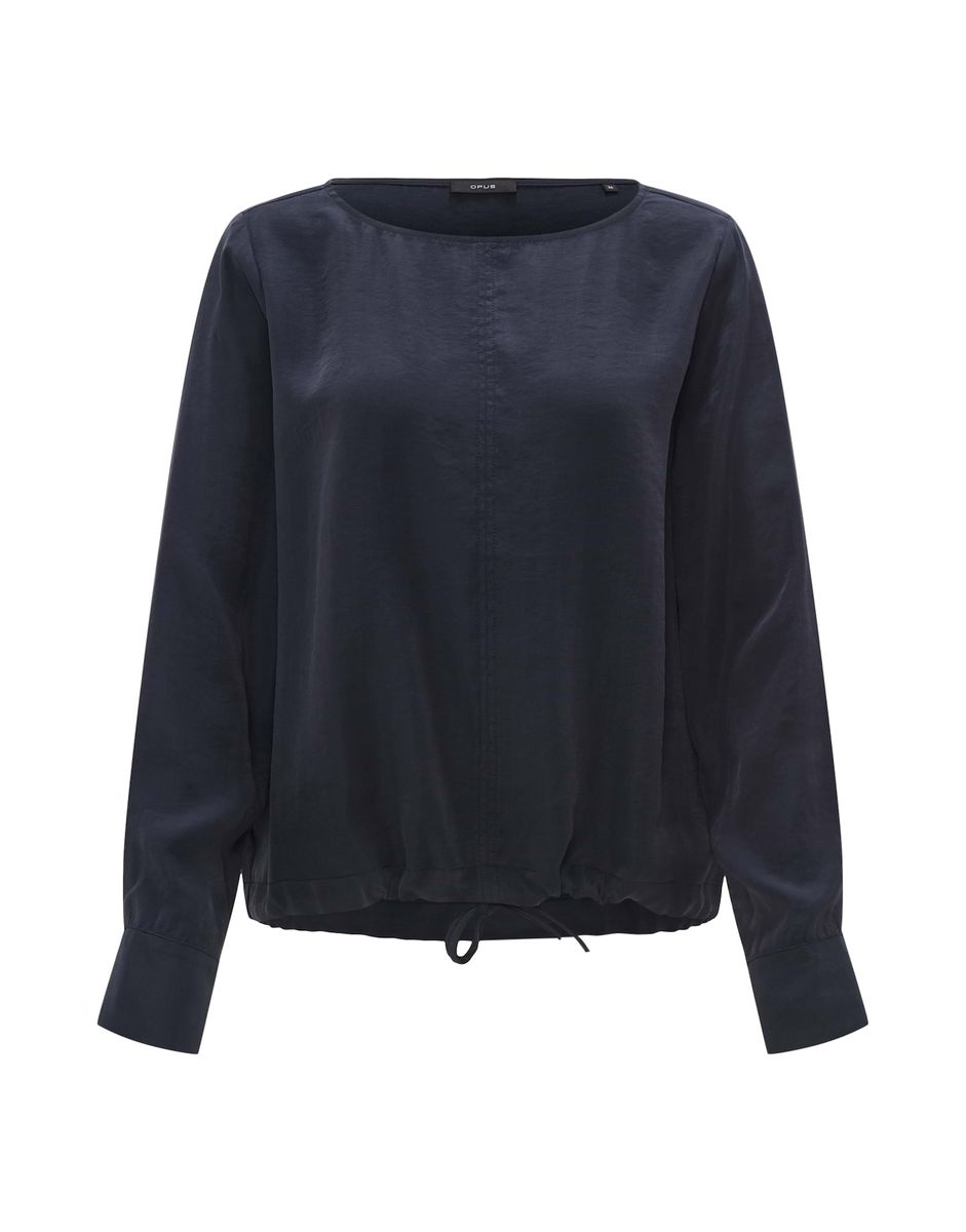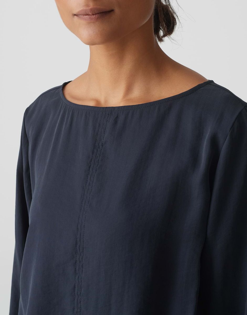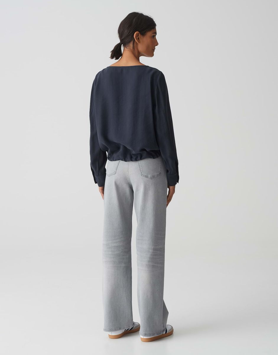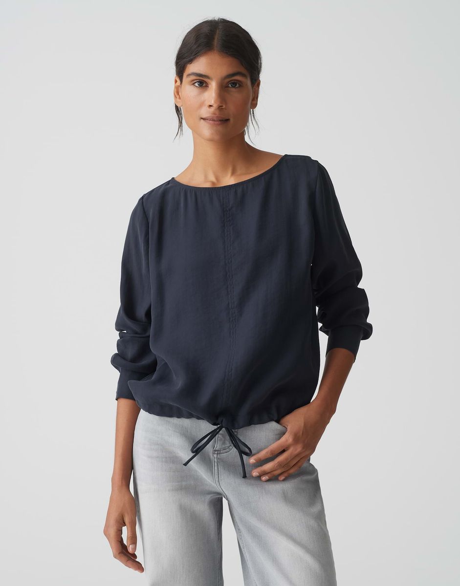 lockere Passform, O-Form, leicht verkürzt geschnitten, Langarm, weiter Rundhalsausschnitt, Rückenlänge ca. 57 cm bei Größe 36, Model Größe 177 cm – trägt Größe 36, Webware, dezente Struktur, weicher Griff, matter Glanz in der Oberfläche, Tunnelzug im Saum, Kordel zum Binden, Längsnaht vorne, klassische Manschetten, überschnittene Schultern