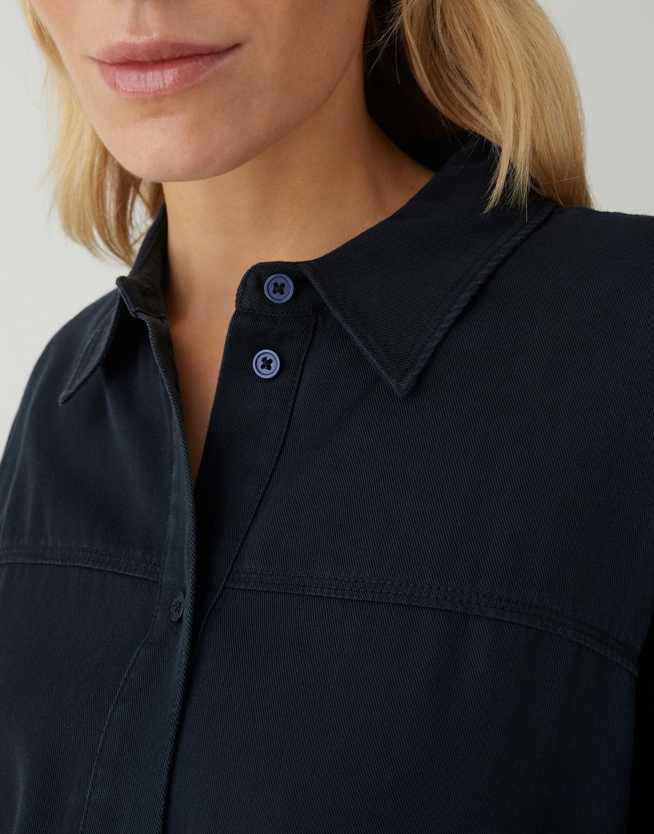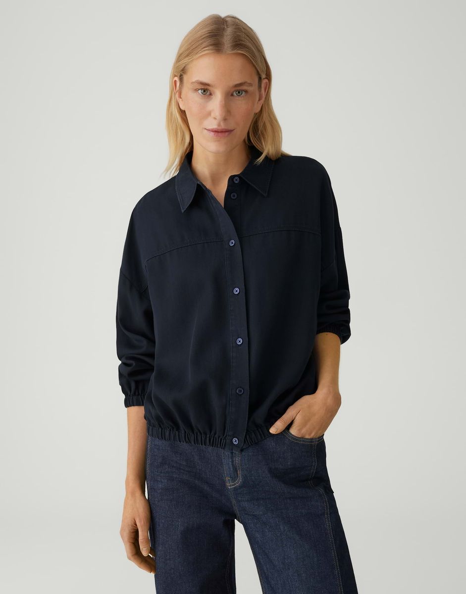 lockere Passform, ovaler Schnitt, leicht verkürzter Schnitt, überschnittene Schulter mit Langarm, Hemdblusenkragen, Rückenlänge ca. 58 cm bei Größe 36, Model Größe 177 cm – trägt Größe 36, Webware, dezente Twillstruktur, glatter Griff, authentische Waschung, fließender Fall, geraffter Ballon-Saum, Knopfleiste, Passe vorn, Teilungsnähte im Rücken, elastischer Gummibund am Ärmel FARBNR