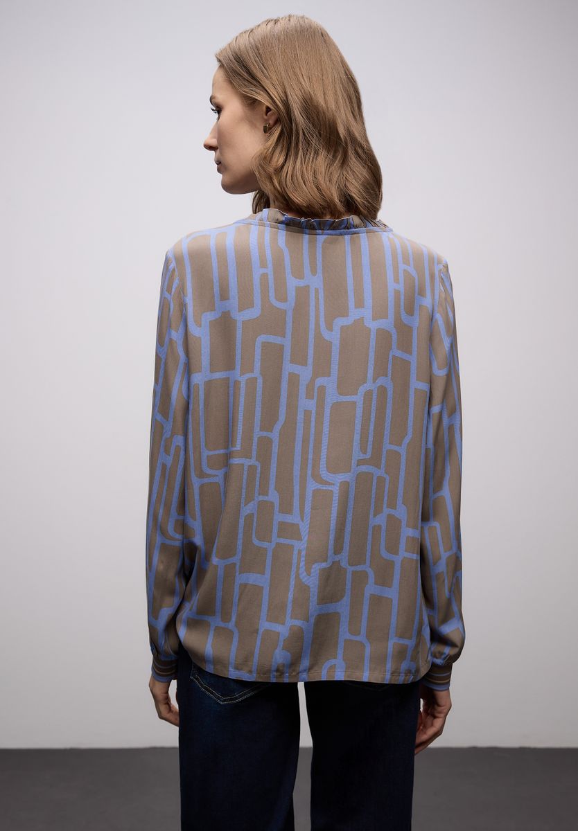 Die Tunika von Street One für Damen kombiniert ein lebendiges grafisches Muster mit dekorativen Tapedetails an den Ärmeln. Rüschen, ein Split Neck mit Bändern und eine Knopfleiste verleihen ihr eine romantisch-verspielte Note. Der weiche Viskosemix sorgt für ein fließendes Tragegefühl. Perfekt für stilvolle Outfits mit Charakter. Bluse mit grafischem Muster Langarm mit Tape-Bündchen Split Neck mit Bändern und Rüschen Knopfleiste Weicher Viskosemix Material: 100% Viskose FARBNR