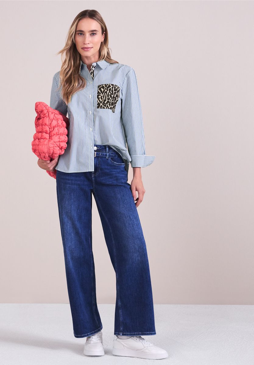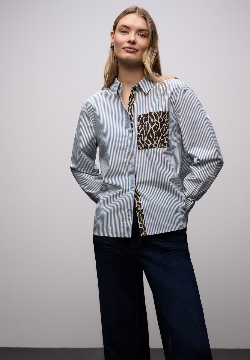Die gestreifte Hemdbluse von Street One für Damen überzeugt mit klassischen Linien und einem modernen Twist. Der Leo-Print an der Brusttasche setzt einen spannenden Akzent, während die reine Baumwolle für angenehmen Tragekomfort sorgt. Ein stilvoller Begleiter für Alltag und Büro. Baumwollbluse Casual Hemdkragen Langarm Modisch Material: 100% Baumwolle FARBNR