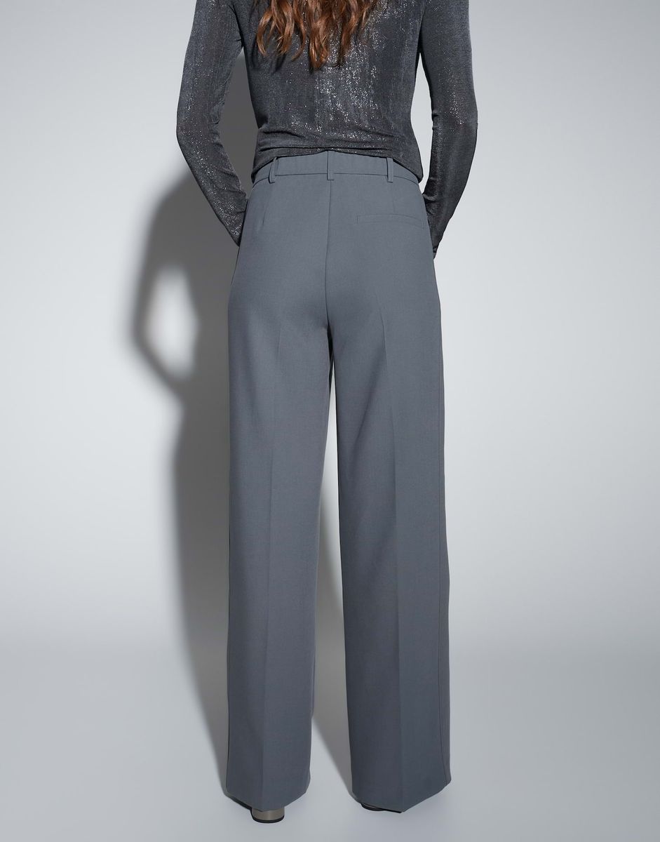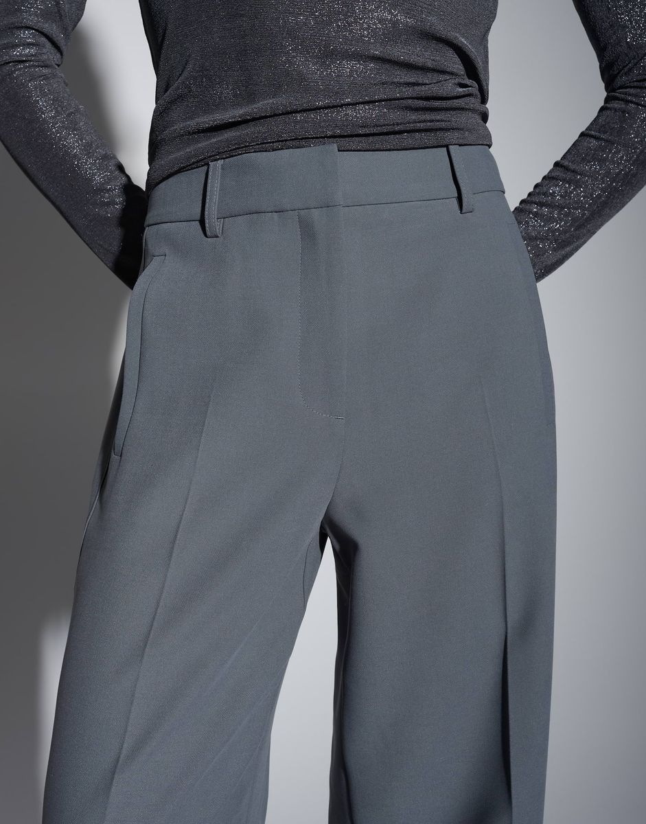 weiter, gerader Beinverlauf, Hosenbein Innenlänge ca. 81 cm in jeder Größe, Model Größe 179 cm – trägt Größe 36, Webware, Piqué Stoff, weicher Griff, samtige Oberfläche, fließender Fall, Nahttaschen vorne, Zier-Paspeltasche hinten, Bügelfalten, verdeckter Zip-Fly FARBNR
