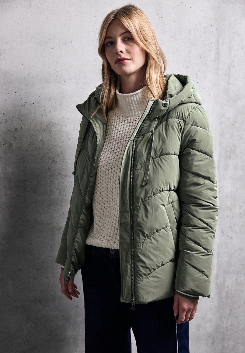 Ein echtes Highlight für urbane Styles: Die Jacke mit welligem Steppmuster von Street One Studio für Damen zieht alle Blicke auf sich. Die Kapuze mit Tunnelzug und seitliche Zipper-Taschen sorgen für praktischen Komfort, während der Reißverschluss den Look lässig abrundet. Perfekt für stilvolle Alltags-Outfits. Winterjacke Kapuze mit Tunnelzug Seitliche Taschen mit Zipper Welliges Steppmuster Reißverschluss Material: Obermaterial: 100% Nylon; Futter: 100% Polyester; Füllung: 100% Polyester FARBNR
