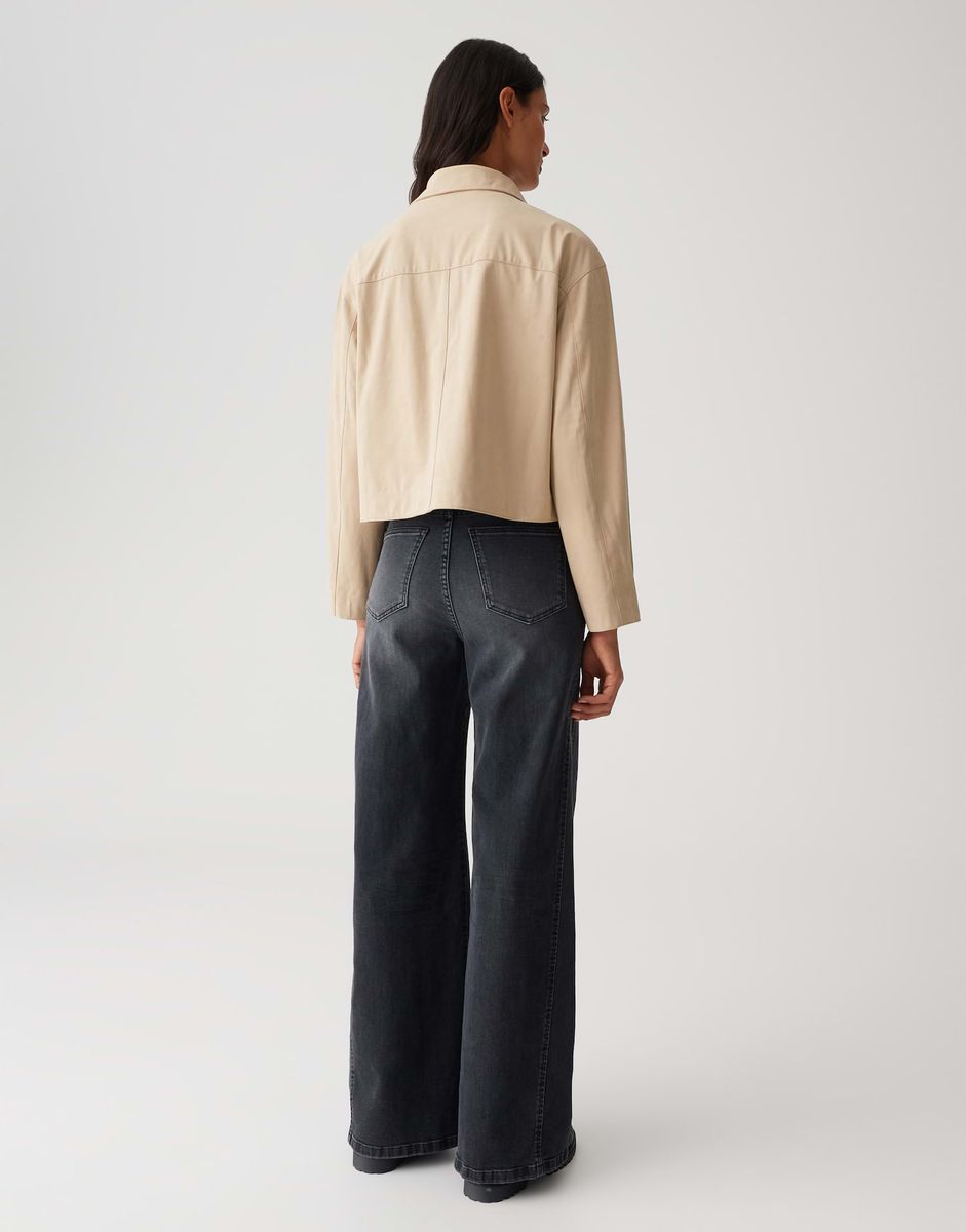 normale Passform, Boxy Silhouette, verkürzte Länge, überschnittene Schulter mit Langarm, Umlegekragen, Rückenlänge ca. 54 cm bei Größe 36, Model Größe 178 cm – trägt Größe 36, Lederimitat, ungefüttert, weicher Griff, elastischer Stoff, aufgesetzte Taschen vorne, abgerundeter Saum, metallische Druckknöpfe, kleine Schlitze in den Seiten FARBNR