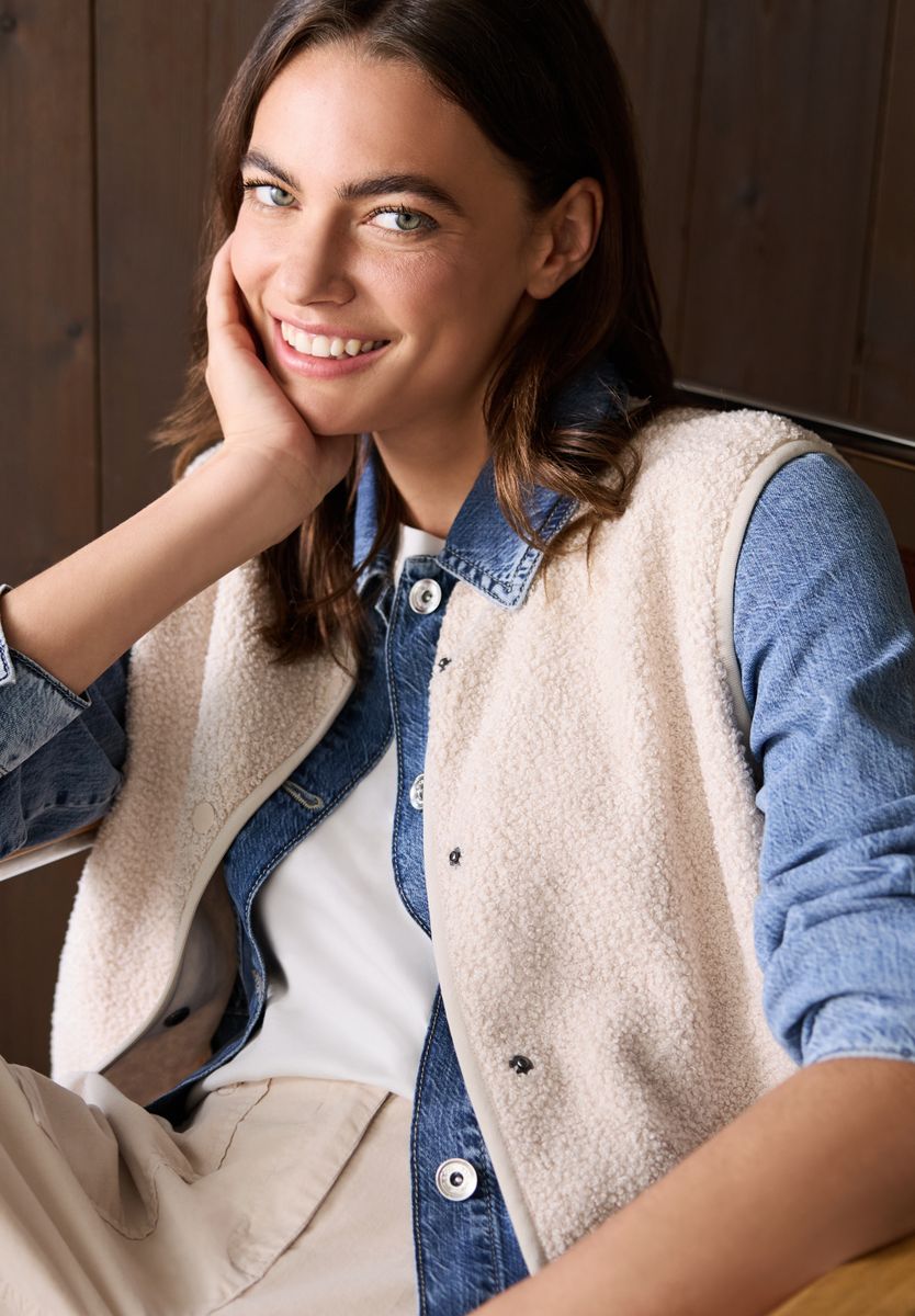 Die Weste von CECIL für Damen präsentiert sich in weicher Wolloptik mit zeitlosem Rundhalsausschnitt. Eine durchgehende Knopfleiste und seitliche Taschen unterstreichen den klassischen Stil. Die softe Qualität macht sie zu einem bequemen Begleiter für kühlere Tage. Damenweste Rundhalsausschnitt Knopfleiste Seitliche Taschen Softe Qualität in Wolloptik Material: 100% Polyester