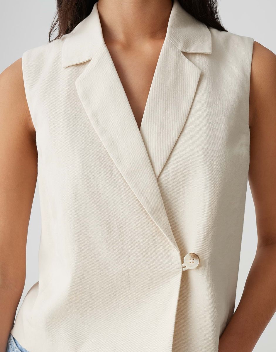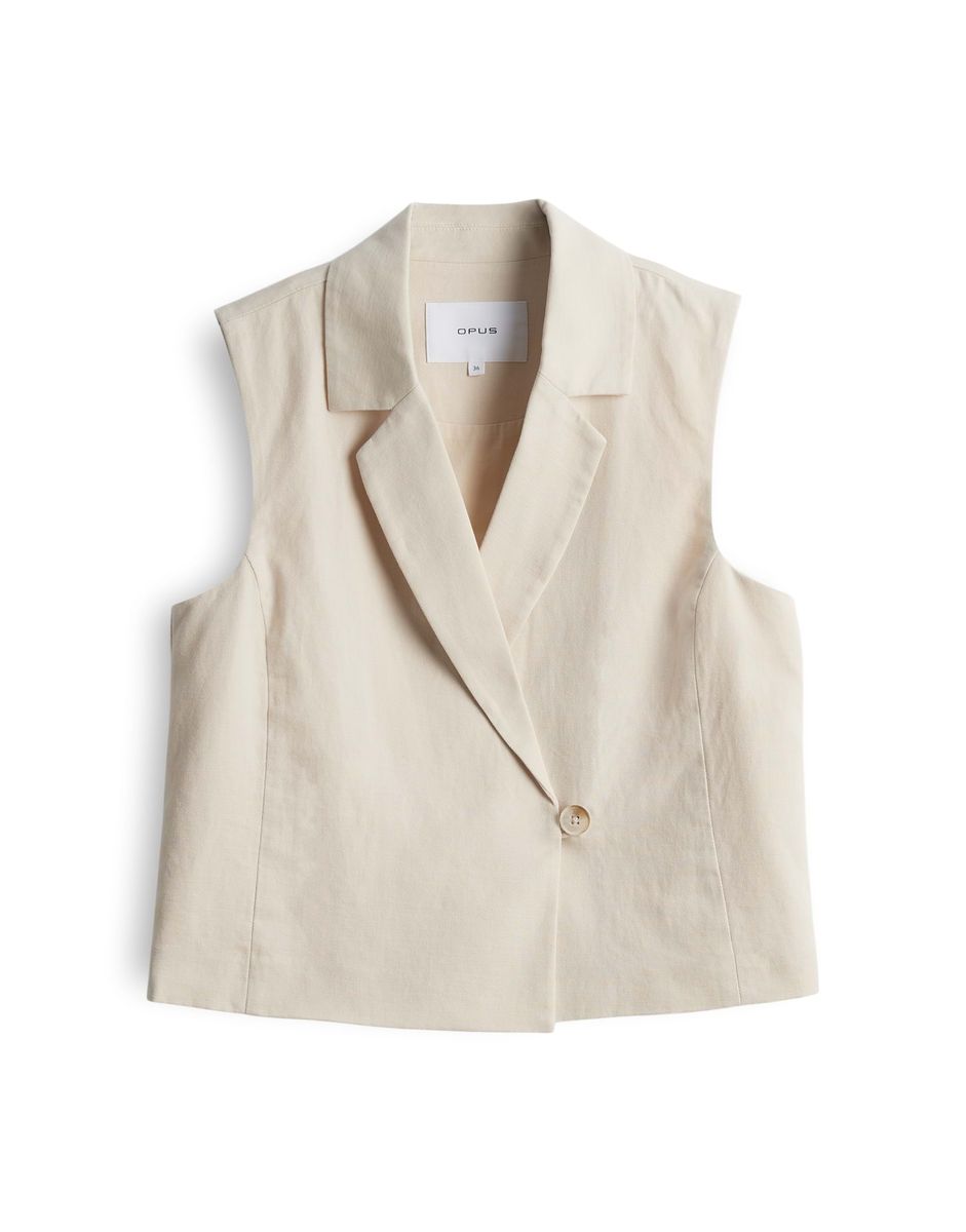 normale Passform, gerader Schnitt, kurz geschnitten, ärmellos, Reverskragen, Rückenlänge ca. 49,5 cm bei Größe 36, Model Größe 177 cm – trägt Größe 36, glattes Innenfutter, Webware, Twill, dezente Struktur, natürlicher Griff, Ein-Knopf-Verschluss
