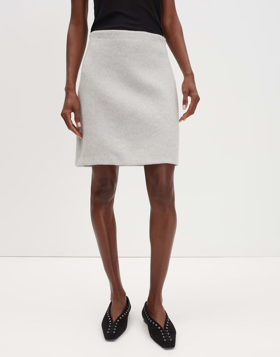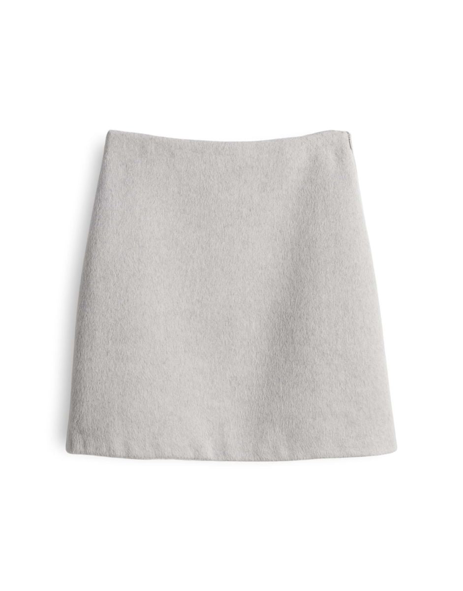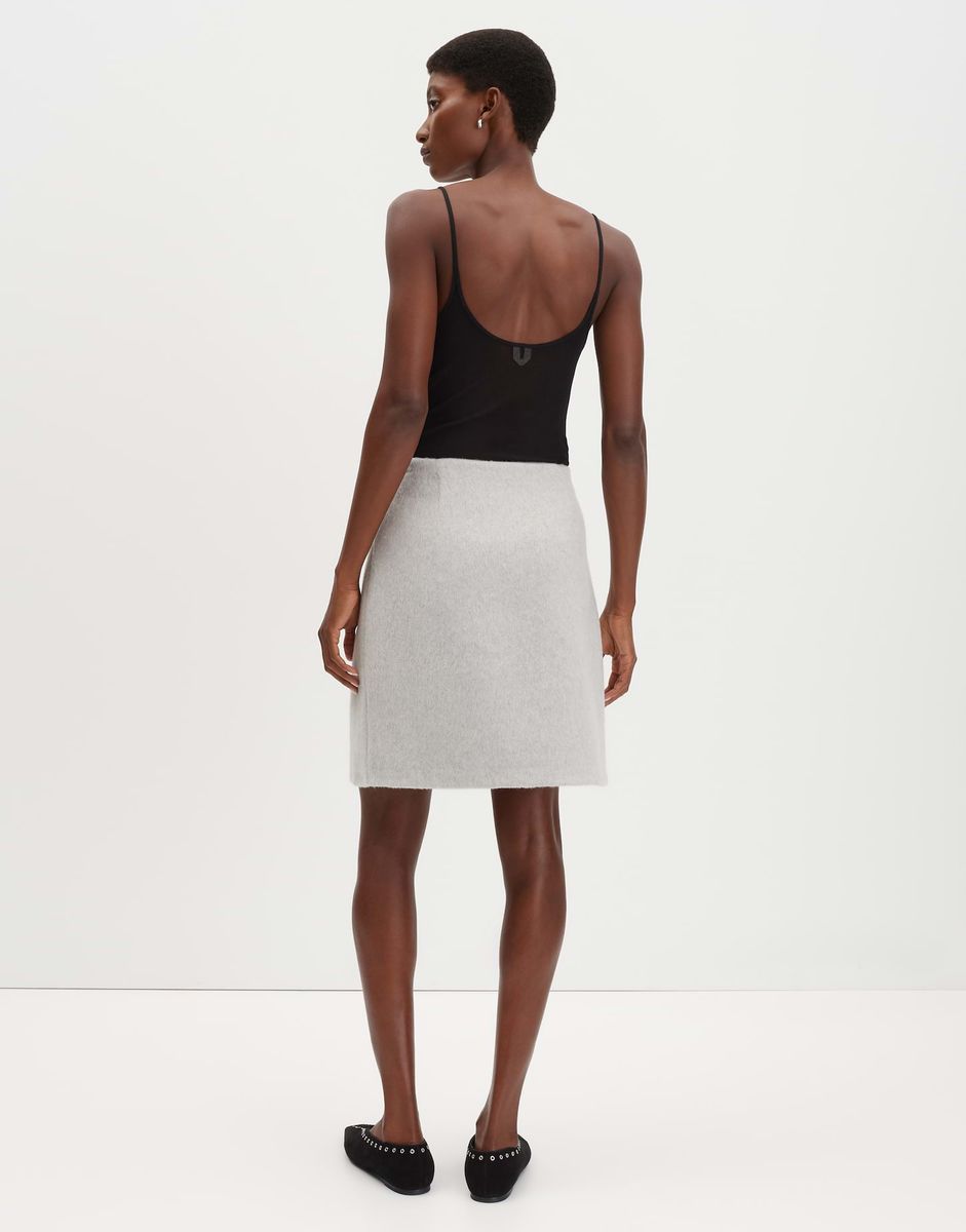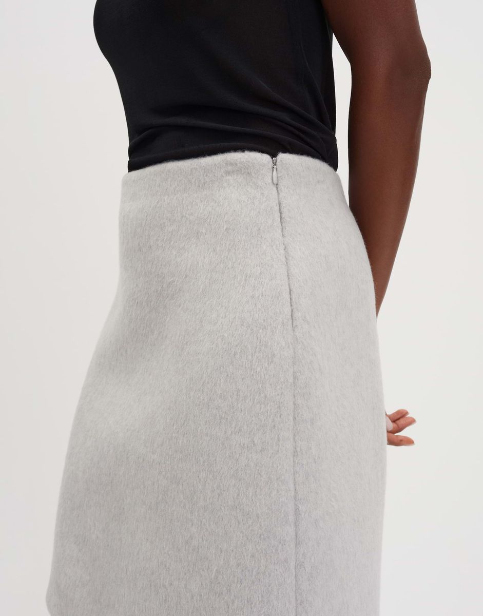 schmale Passform, Mini-Länge, hintere Länge ca. 48 cm in Größe 36, Model Größe 176 cm – trägt Größe 36, Wollmix, ungefüttert, weicher Griff, gebürstete Oberfläche, Reißverschluss in der Seite, Abnäher im Bund FARBNR