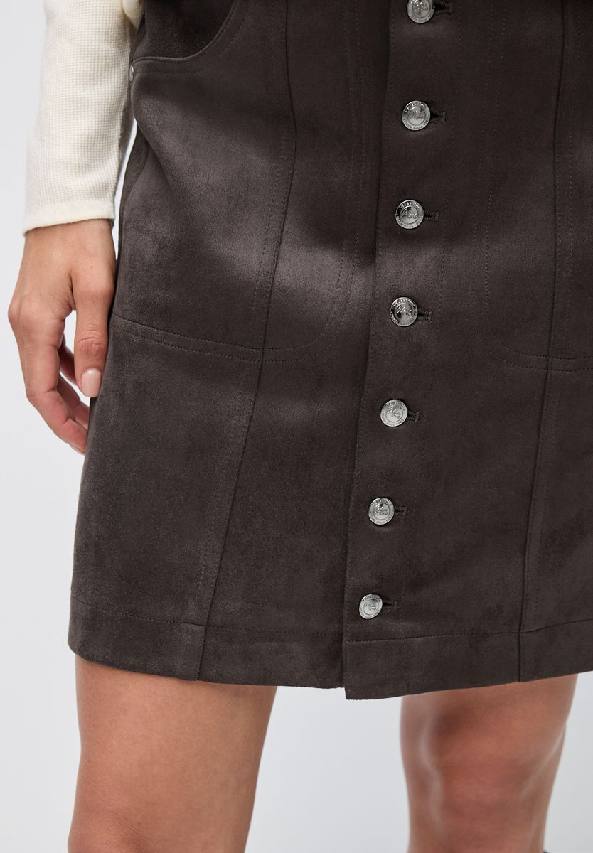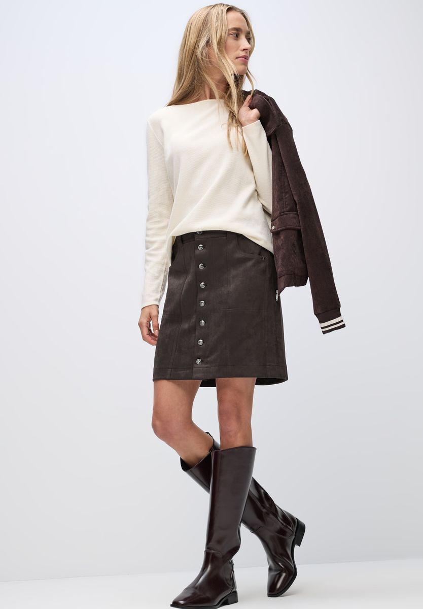 Der knielange Veloursrock von Street One für Damen überzeugt mit seiner soften Qualität und femininen Details. Die durchgehende Knopfleiste und seitliche Taschen verleihen dem Rock eine lässig-elegante Ausstrahlung. In Unifarbe ist er vielseitig kombinierbar – perfekt für stilvolle Casual-Looks. Knielanger Rock Seitliche Taschen Knopfleiste vorne Unifarbe Softe Veloursqualität Material: 95% Polyester, 5% Elasthan FARBNR