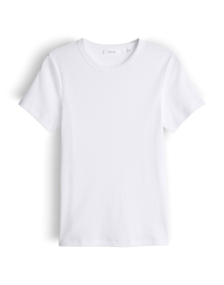 schmale Passform, figurbetonter Schnitt, Kurzarm, Rundhalsausschnitt, Rückenlänge ca. 58 cm bei Größe 36, Model Größe 177 cm – trägt Größe 36, Jersey, feine Rippstruktur, elastischer Stoff, bogenförmige Spitzenborten FARBNR