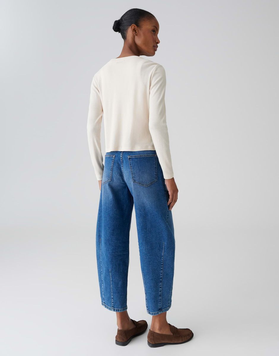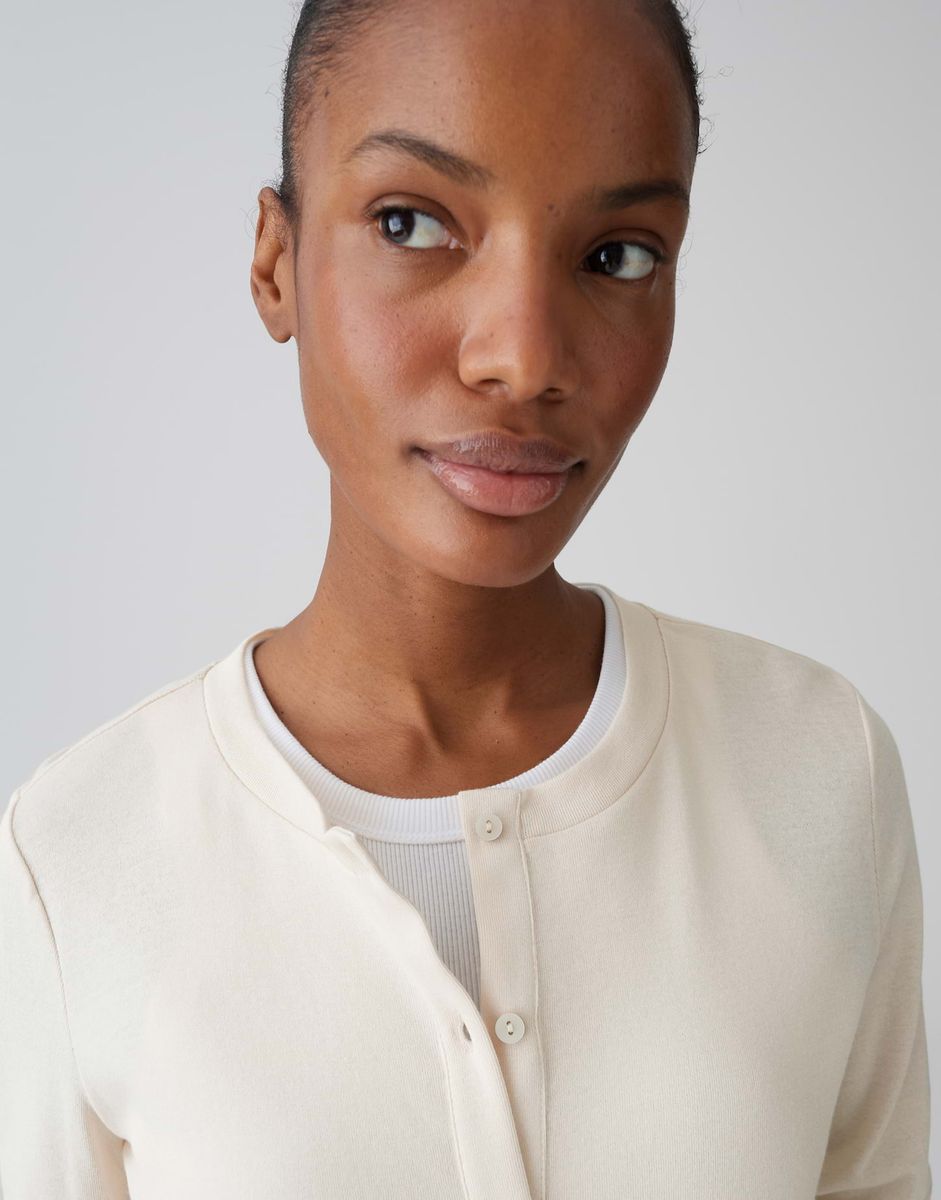 schmale Passform, figurbetonter Schnitt, leicht verkürzter Schnitt, Langarm, Rundhalsausschnitt, Rückenlänge ca. 50 cm bei Größe 36, Model Größe 177 cm – trägt Größe 36, Jersey, leichter Stoff, leicht elastisch, leichte Transparenz, Knopfleiste FARBNR