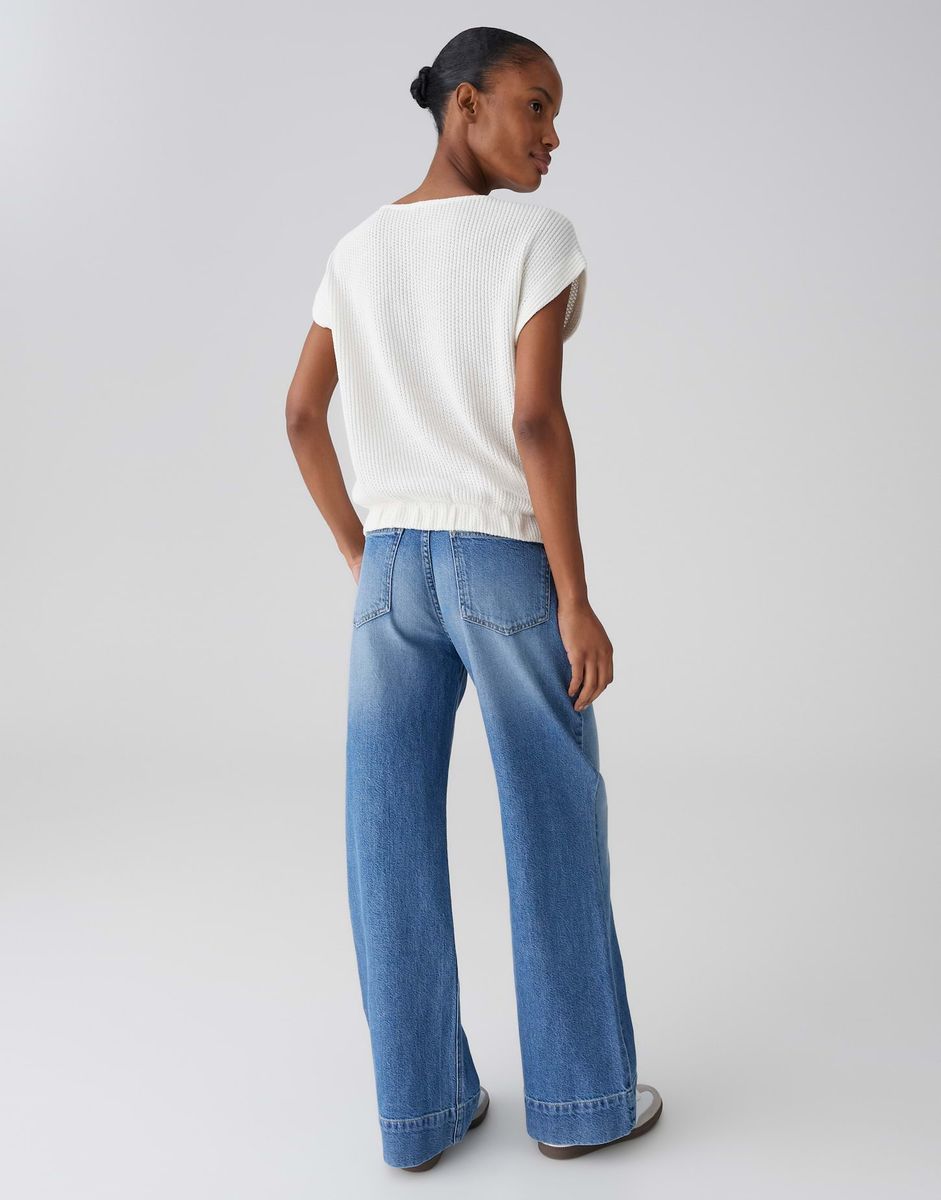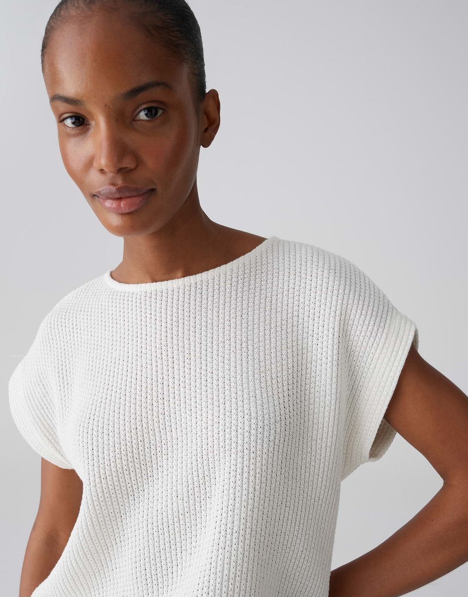 lockere Passform, schmal zulaufender Schnittt, ärmellos, U-Boot-Ausschnitt, Rückenlänge ca. 56 cm bei Größe 36, Farbe pale olive: Model Größe 174 cm – trägt Größe 36, Farbe milk: Model Größe 177 cm – trägt Größe 36, Jersey, Strick Optik, fester Griff, leichte Transparenz, Gummibund am Saum FARBNR