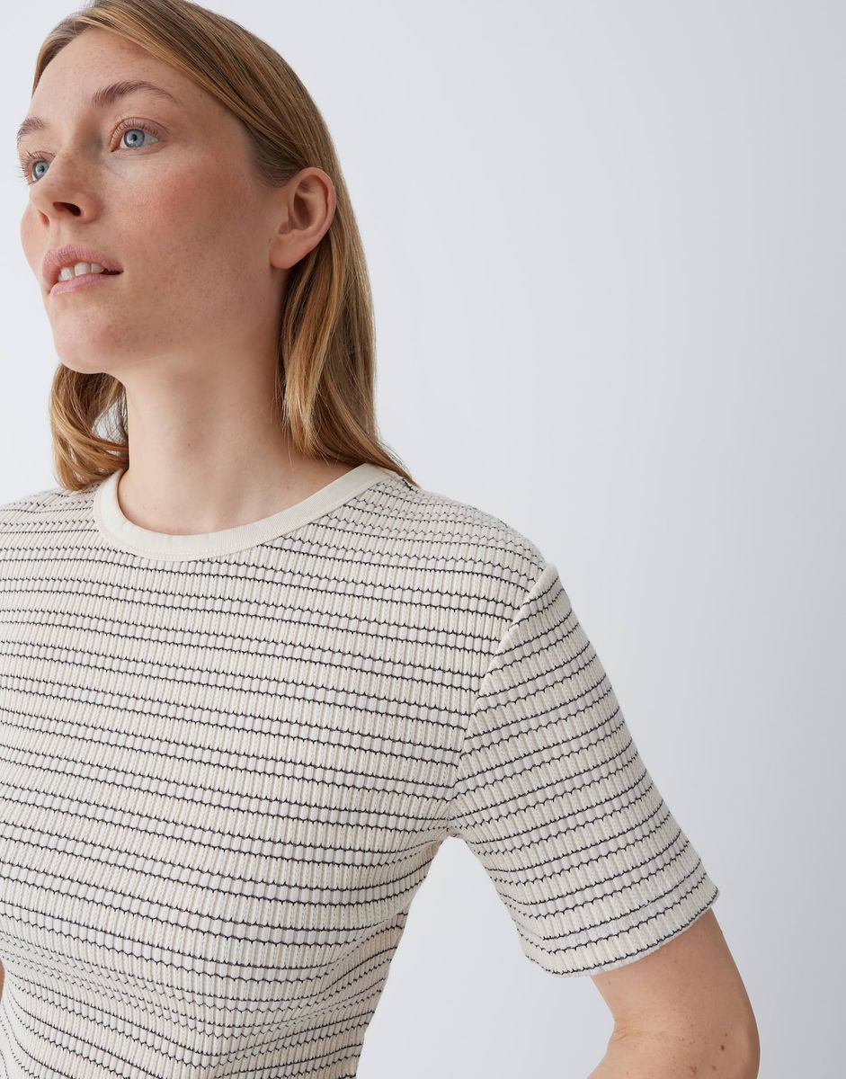 schmale Passform, figurbetonter Schnitt, Kurzarm, Rundhalsausschnitt, Rückenlänge ca. 58 cm bei Größe 36, Model Größe 174 cm – trägt Größe 36, Jersey, feine Rippstruktur, weicher Griff, elastischer Stoff, Streifenmuster, kontrastfarbene Rippbündchen FARBNR