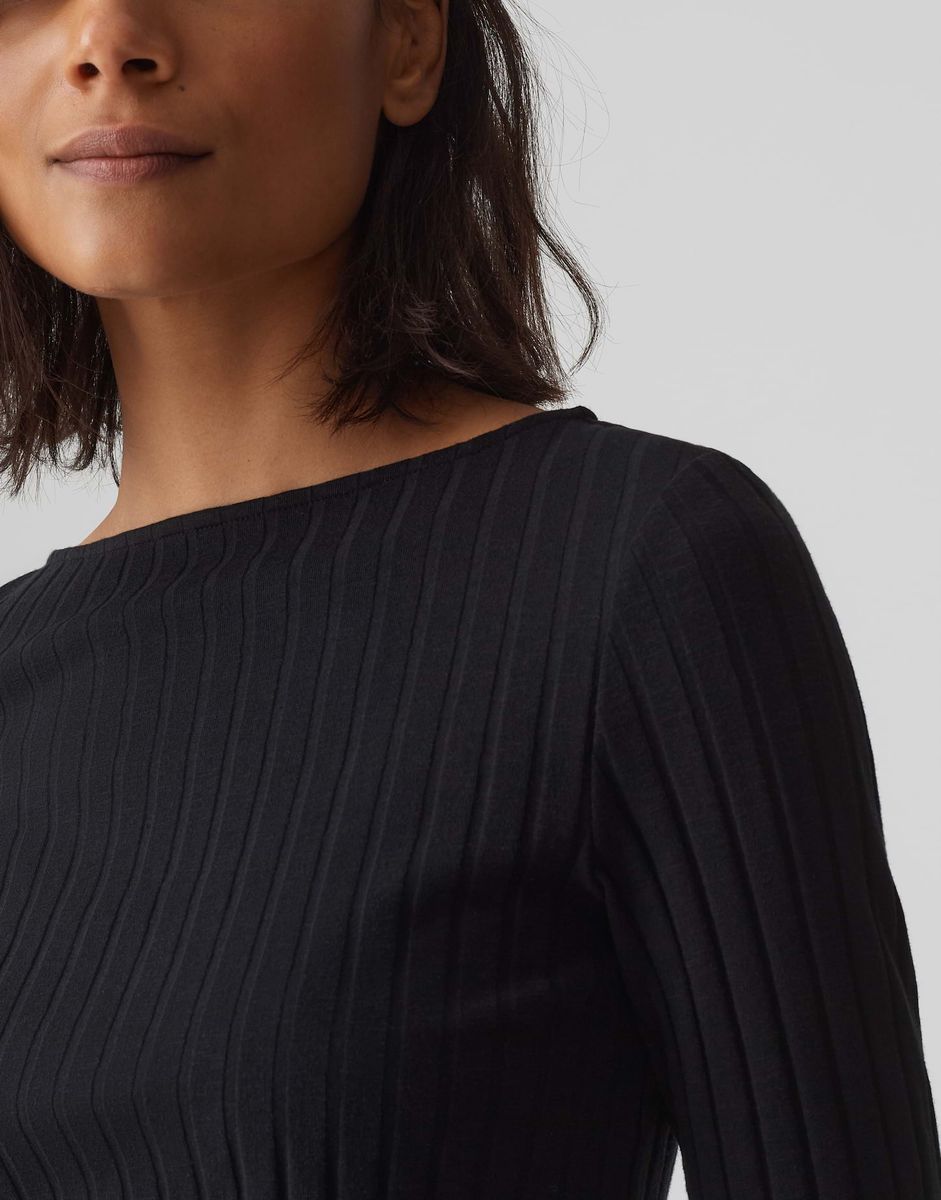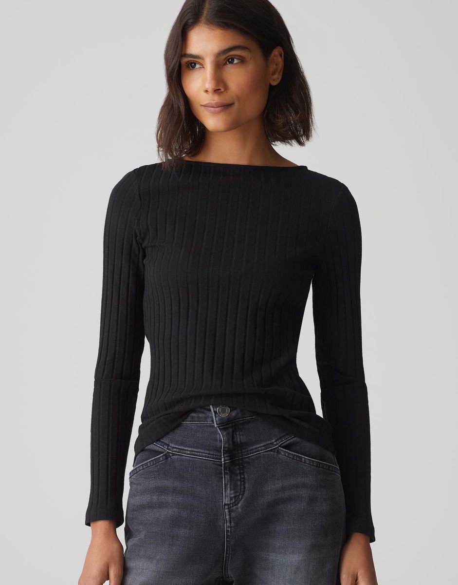 schmal geschnitten, U-Boot-Aussschnitt, Langarm, Rückenlänge ca. 58 cm bei Größe 36, Model Größe 178 cm – trägt Größe 36, Baumwoll Mix, softer Jersey, breite Rippstruktur FARBNR