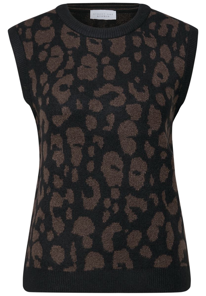 Der ärmellose Jacquard Pullover von Street One Studio für Damen kombiniert modernen Animal Print mit klarer Silhouette. Rundhalsausschnitt und weiches Material sorgen für angenehmen Tragekomfort – perfekt zum Layern oder solo getragen. Ein trendstarkes It-Piece für ausdrucksstarke Styles. Strickpullover mit Leo Muster Rundhalsausschnitt Ärmellos Animal Print Angenehmer Tragekomfort Material: 50% Nylon, 27% Polyacryl, 18% Baumwolle, 5% Elasthan FARBNR