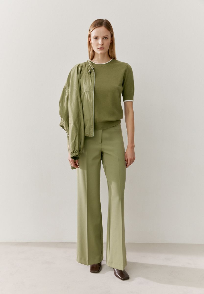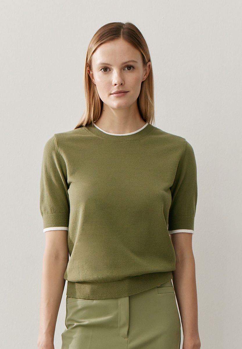 Der attraktive Kurzarm-Pullover von MORE & MORE mit feinen, weißen Streifen am Ausschnitt und an den Ärmeln sieht sowohl zum Rock als auch zur Hose sehr gut aus. FARBNR