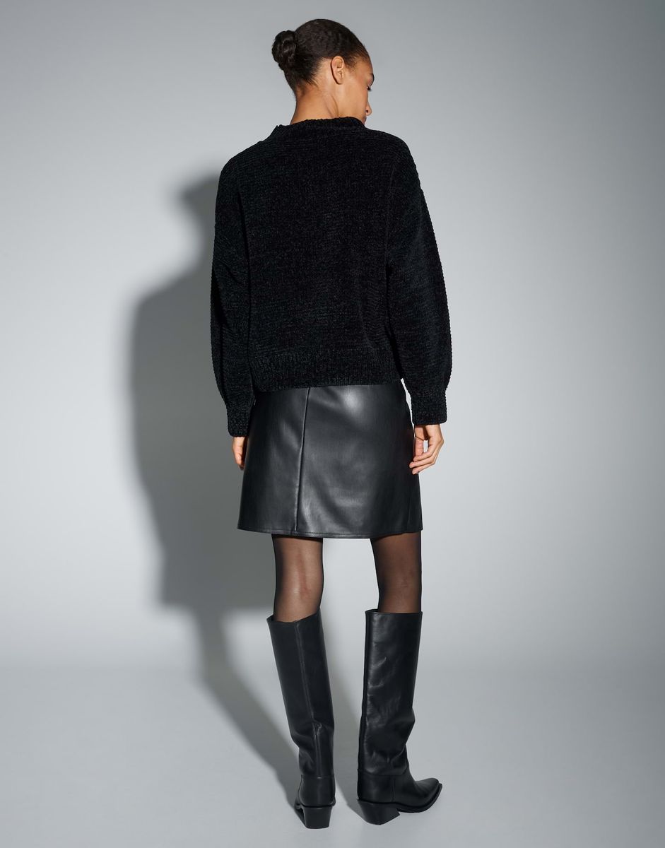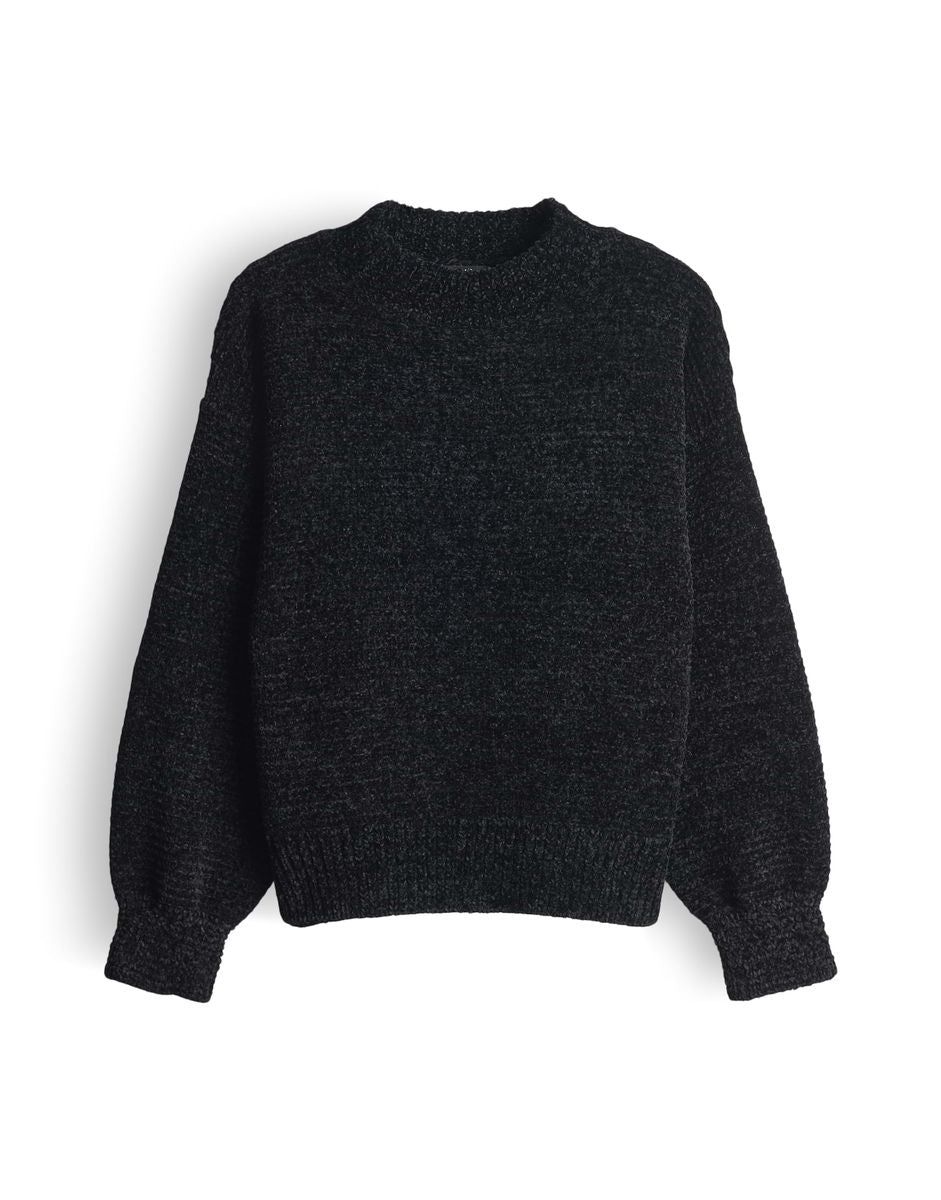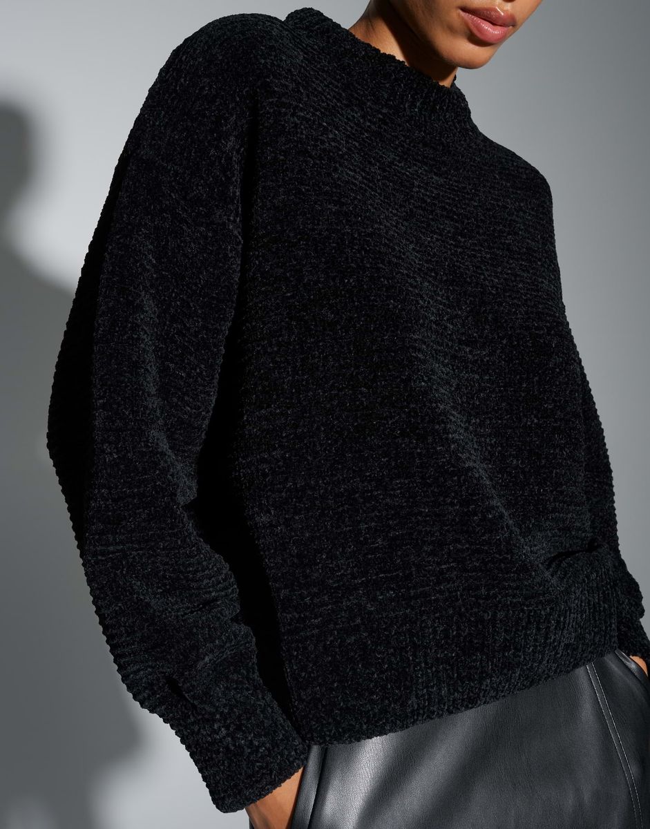 lockere Passform, schmal zulaufend, überschnittene Schulter mit Langarm, Rundhalsausschnitt, Rückenlänge ca. 54 cm bei Größe 36, Model Größe 177 cm – trägt Größe 36, Chenille, Strick, Rippstruktur, extrem weicher Griff, samtige Oberfläche, Strickbündchen FARBNR