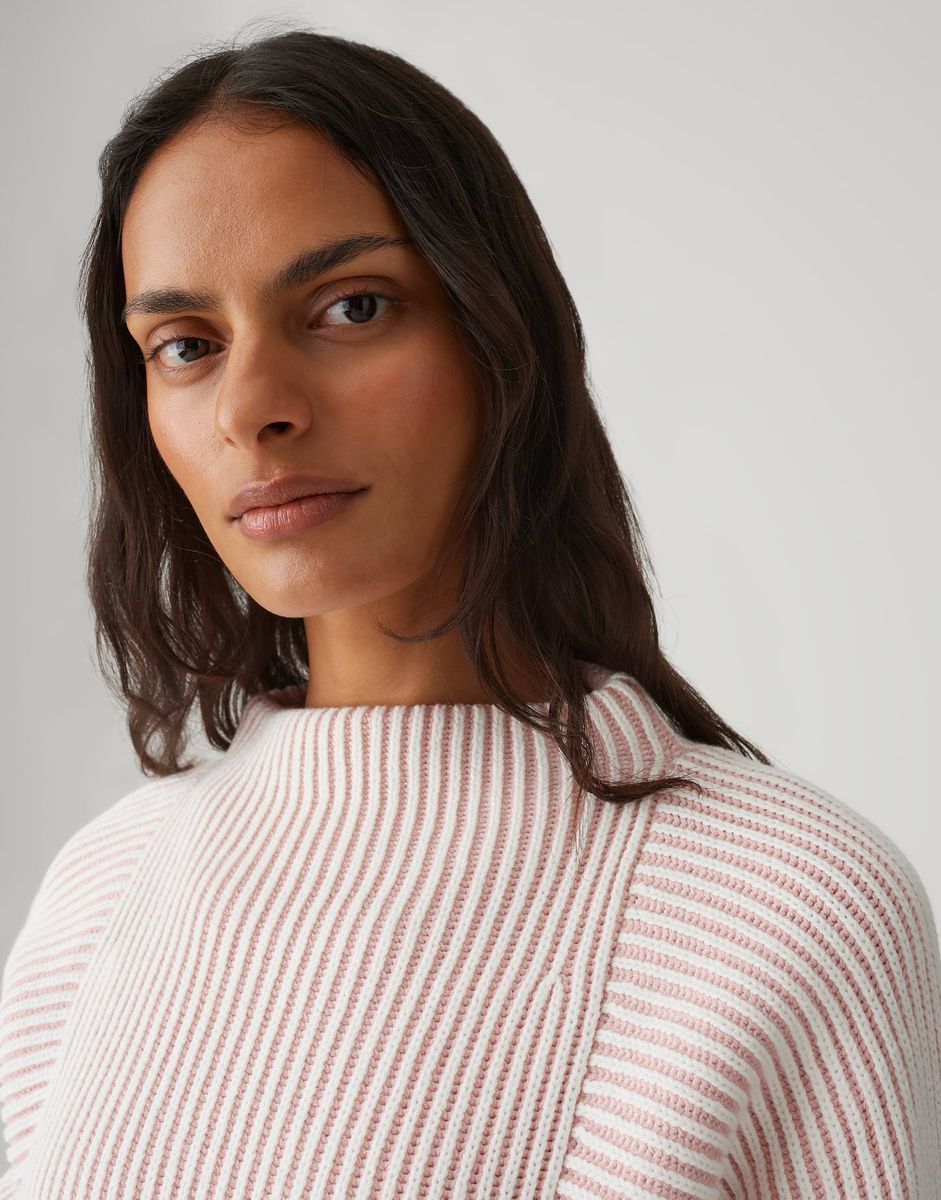 lockere Passform, schmal zulaufender Schnittt, leicht verkürzter Schnitt, langer Fledermausärmel, Rückenlänge ca. 53 cm bei Größe 36, Model Größe 177 cm – trägt Größe 36, Strick, Rippstruktur, weicher Griff, wärmend, zweifarbiges Muster, farblich abgesetzte Strickbündchen FARBNR