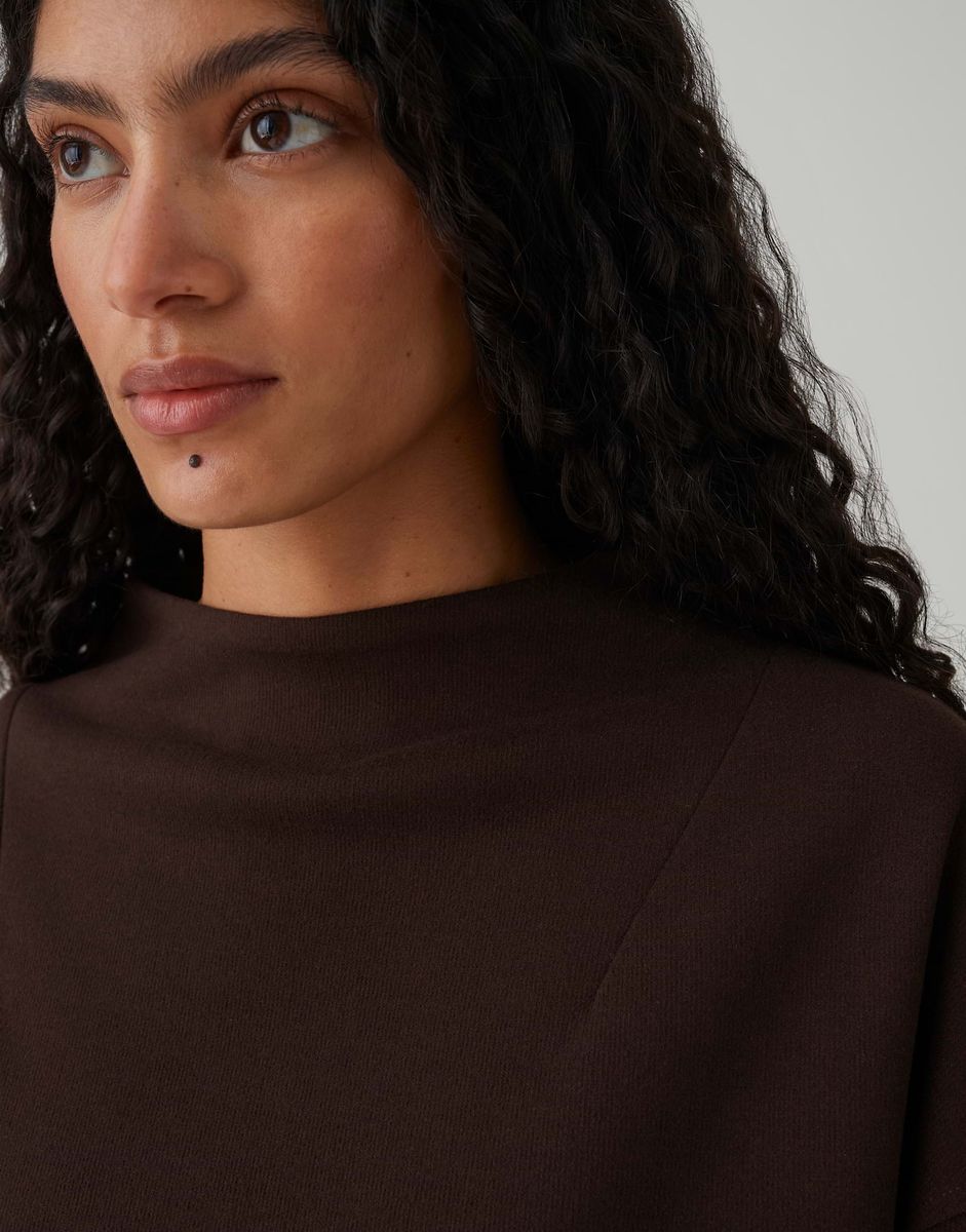 weite Passform, schmal zulaufender Schnittt, überschnittene Schulter mit Langarm, Funnel Neck, Rückenlänge ca. xx cm bei Größe 36, Model Größe 177 cm – trägt Größe 36, Sweatware, dezente Struktur, weicher Griff, samtige Oberfläche, elastischer Stoff, Knopfdetail am Ärmelsaum FARBNR
