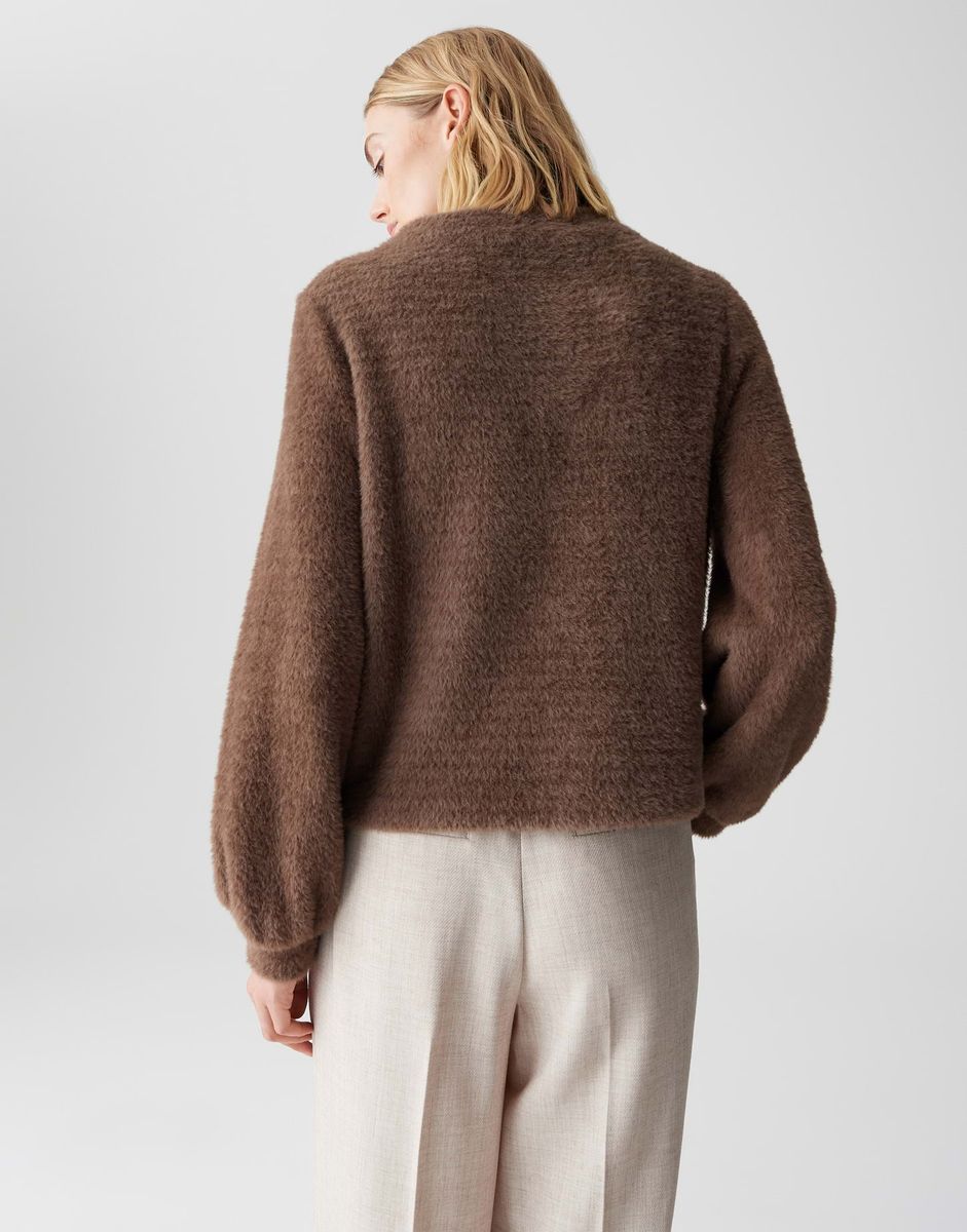 lockere Passform, gerader Schnitt, überschnittene Schulter mit Langarm, Funnel Neck, Rückenlänge ca. 58 cm bei Größe 36, Model Größe 179 cm – trägt Größe 36, Sweatware, haarige Struktur, flauschiger Griff, elastischer Stoff, wärmend, Ballonärmel FARBNR