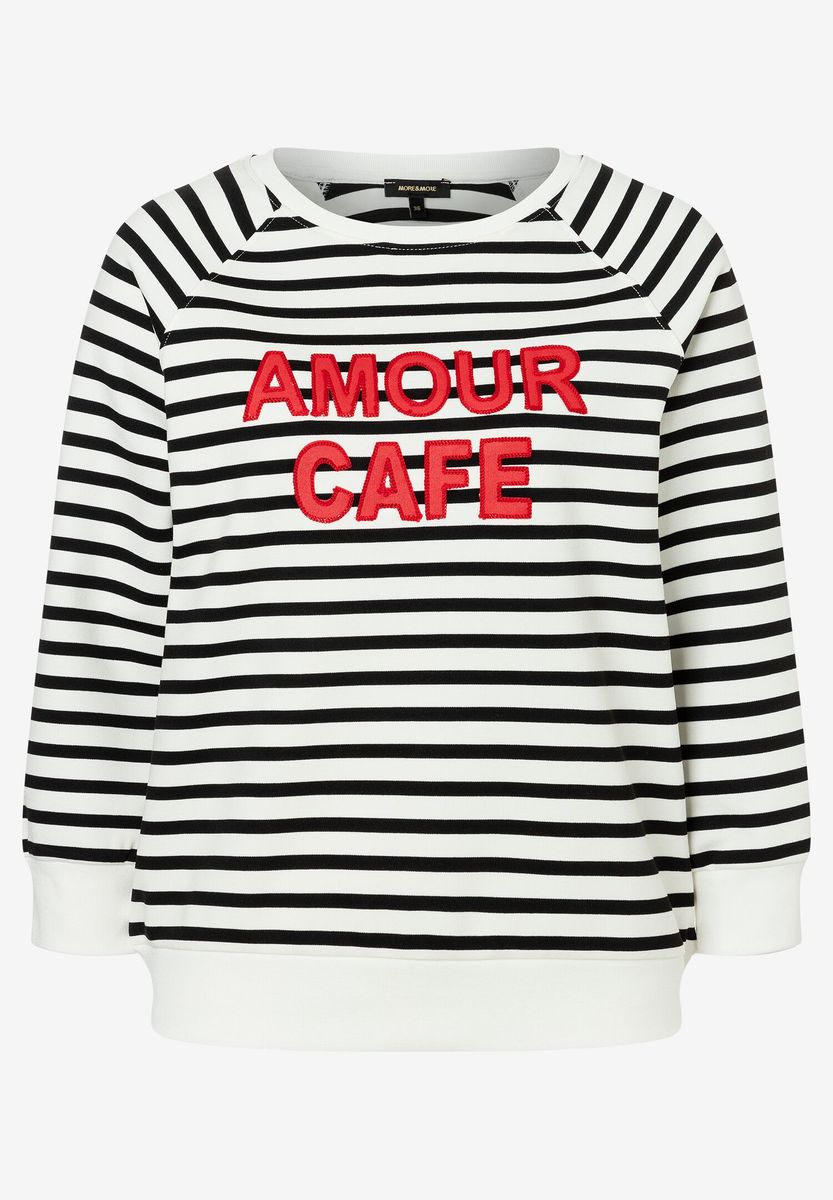 Das schwarz/ecru gestreifte Sweatshirt von MORE & MORE mit roter Schrift auf der Front sieht zur weiten, verwaschenen Jeans einfach "obersüß" aus. FARBNR