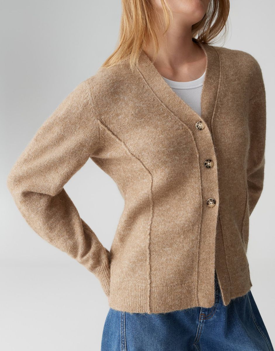 figurbetonte Passform, tailliert, Langarm, V-Ausschnitt, Rückenlänge ca. 61 cm bei Größe 36, Model Größe 174 cm – trägt Größe 36, Strick, weicher Griff, Strickbündchen, Knopfleiste FARBNR