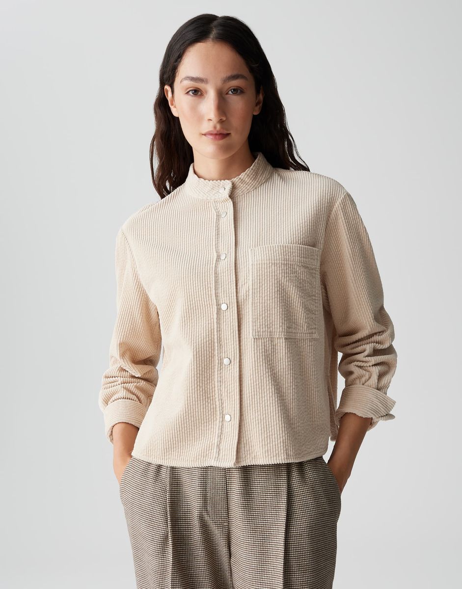 lockere Passform, Boxy Fit, verkürzte Länge, überschnittene Schulter mit Langarm, Stehkragen, Rückenlänge ca. 56 cm bei Größe S, Model Größe 176 cm – trägt Größe S, Größenempfehlung Gr. S: 36/38 - Gr. M: 40/42 - Gr. L: 44, weicher Griff, samtige Oberfläche, Cord, Rippstruktur, aufgesetzte Brusttasche, Knopfleiste, metallische Druckknöpfe, Schlitze in den Seiten FARBNR