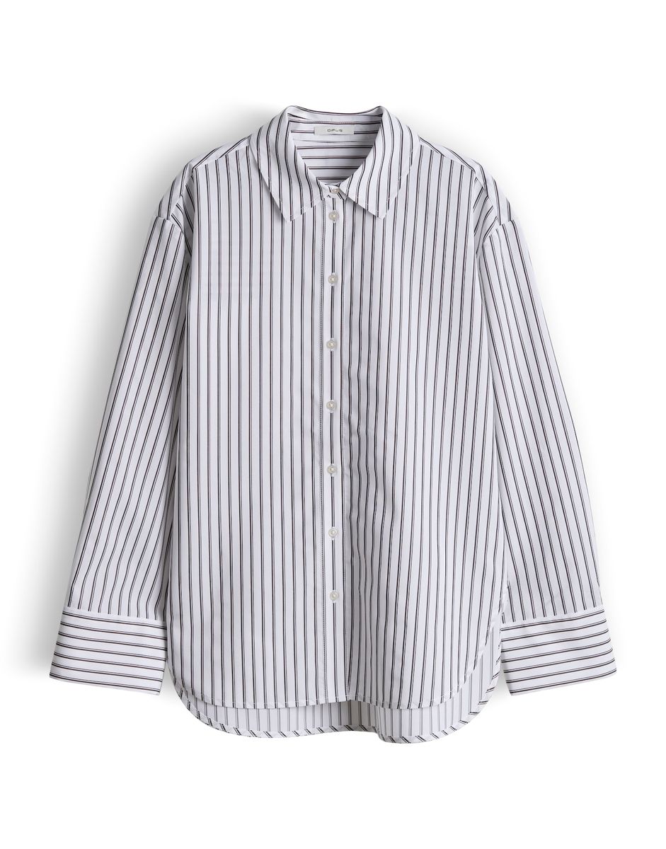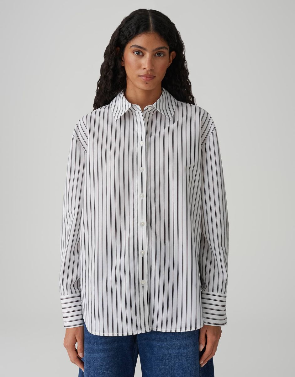weite Passform, gerader Schnitt, hinten länger als vorne, überschnittene Schulter mit Langarm, Hemdblusenkragen, Rückenlänge ca. 71 cm bei Größe 36, Model Größe 176 cm – trägt Größe 36, Webware, glatter Griff, formstabil, pflegeleicht, Streifenmuster, Kellerfalte im Rücken, abgerundeter Saum, Knopfleiste FARBNR