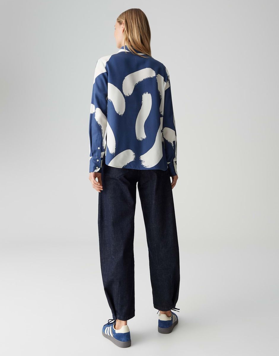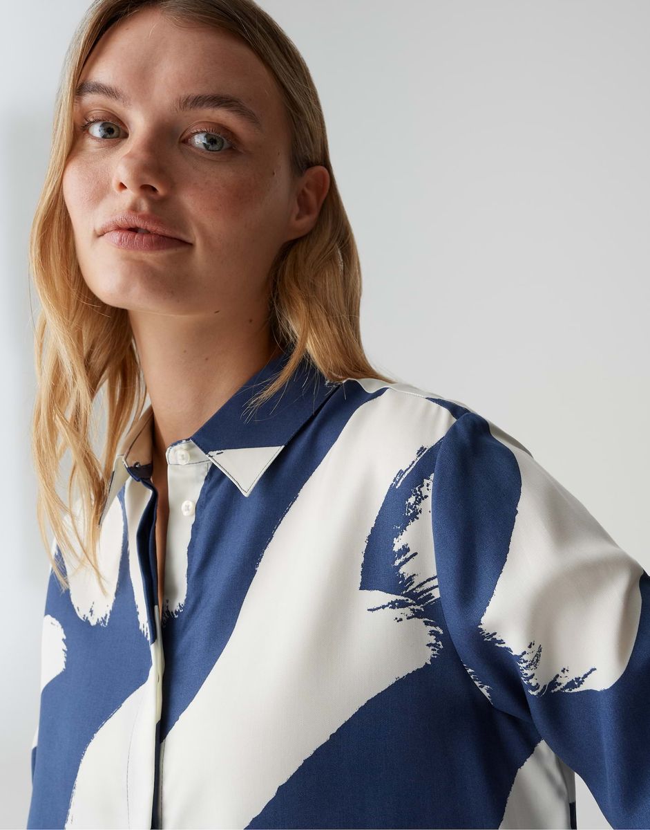 lockere Passform, gerader Schnitt, Hemdblusenkragen, Langarm, Rückenlänge ca. 68 cm bei Größe 36, Model Größe 180 cm – trägt Größe 36, Webware, leichter Stoff, fließender Fall, matter Glanz in der Oberfläche, abgerundeter Saum, Knopfleiste, Kellerfalte im Rücken FARBNR