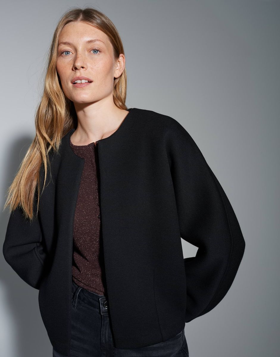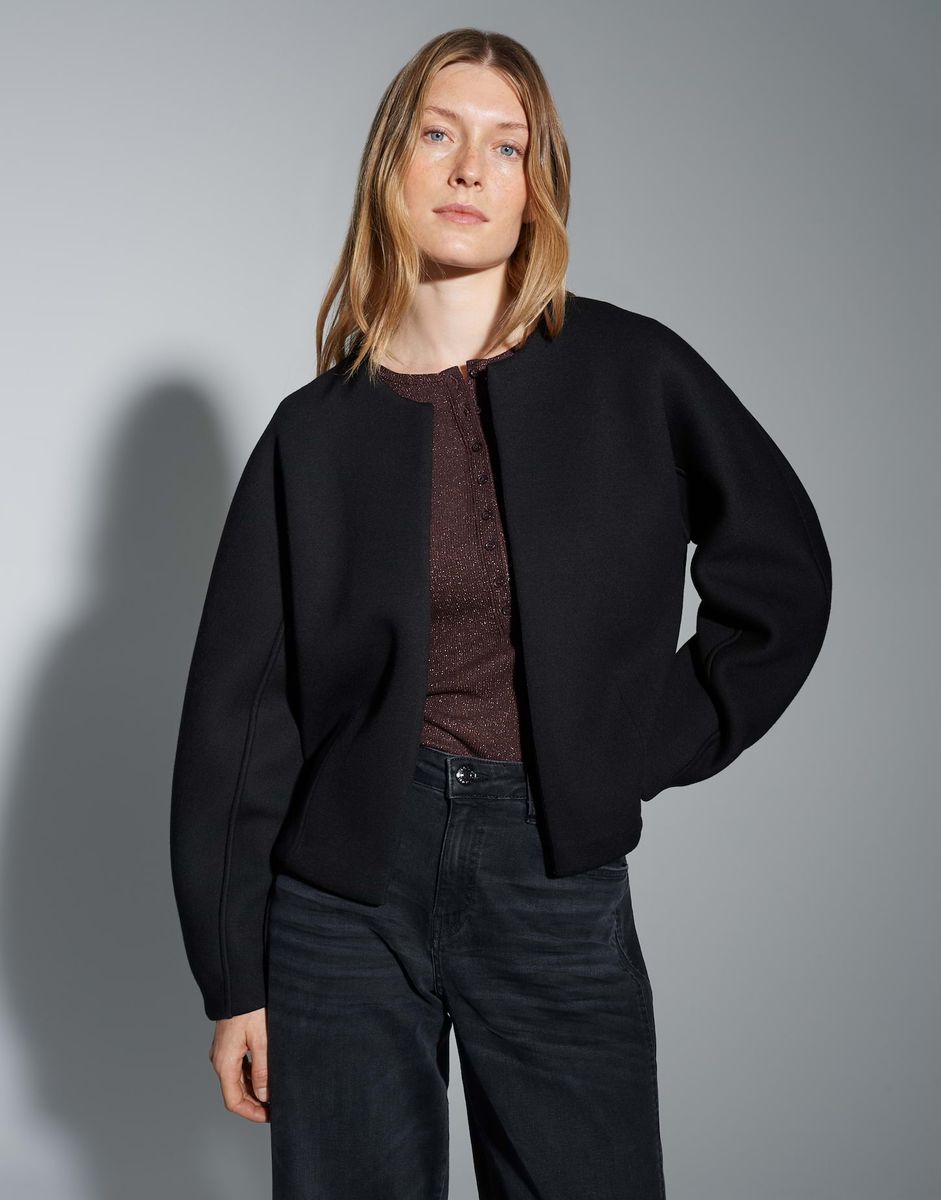 weite Passform, ovaler Schnitt, verkürzt geschnitten, Langarm, Rundhalsausschnitt, Rückenlänge ca. 53 cm bei Größe S, Model Größe 174 cm – trägt Größe S, Größenempfehlung Gr. S: 36/38 - Gr. M: 40/42 - Gr. L: 44, Sweatware, glatter Griff, matter Glanz in der Oberfläche, voluminöser Fall, Scuba, Abnäher am Saum, Ballonärmel FARBNR