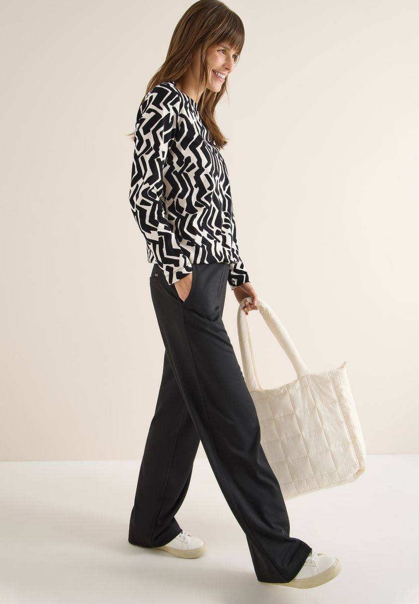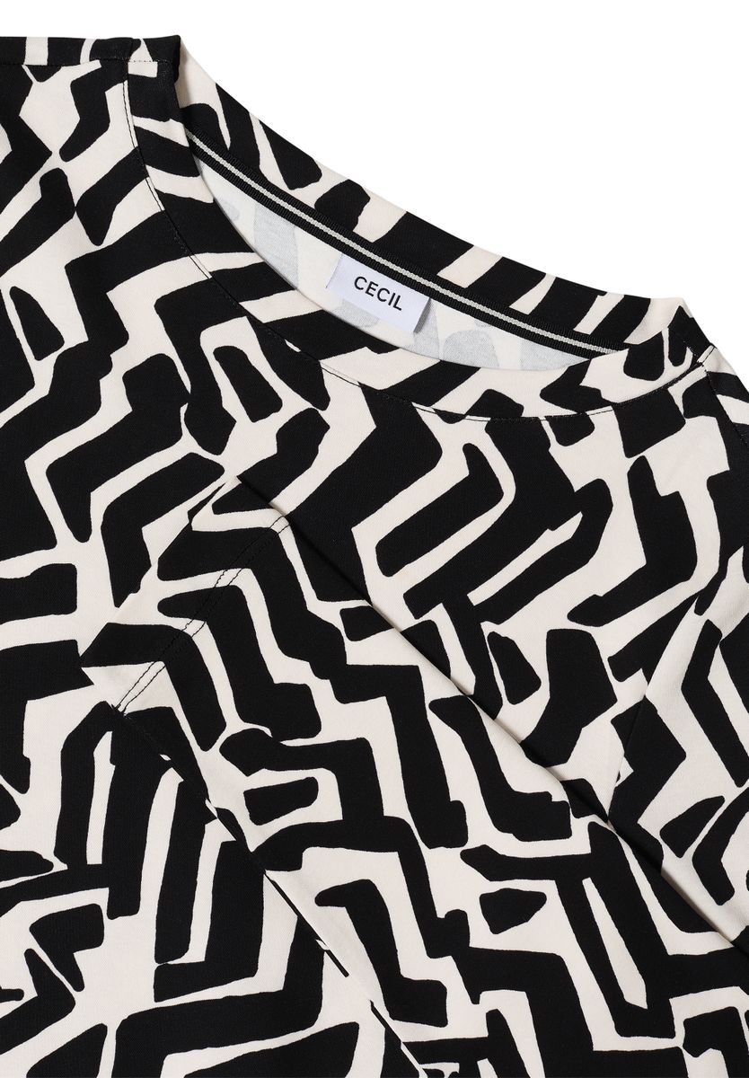 Mit seinem grafischen Muster und elastischem Saum bringt dieses Shirt von CECIL für Damen frischen Schwung in deine Garderobe. Der U-Boot-Ausschnitt und die langen Ärmel unterstreichen den femininen Stil. Ein vielseitiges Oberteil für deinen modischen Alltag. Damenshirt Grafisches Muster Elastischer Saum U-Boot-Ausschnitt Langarm Material: 100% Baumwolle FARBNR