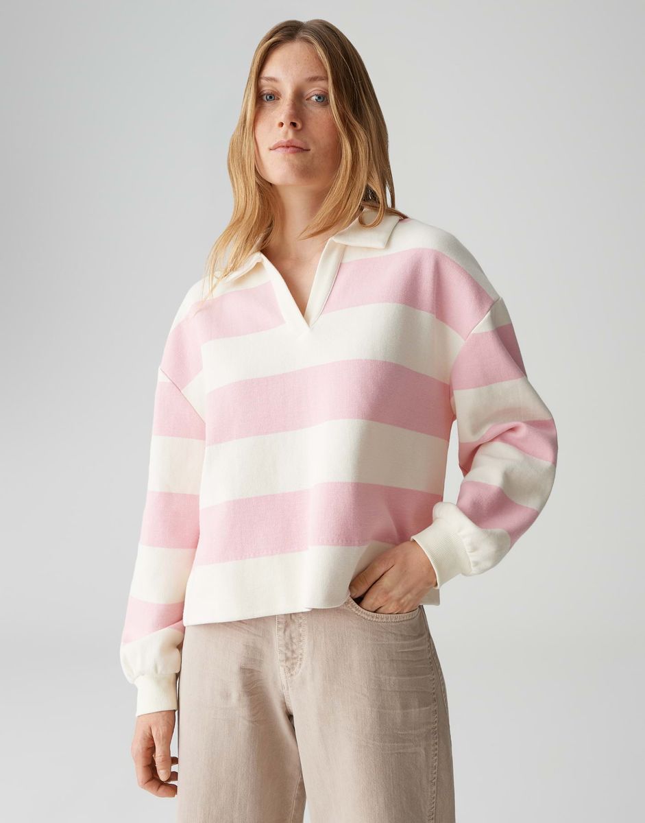 weite Passform, gerader Schnitt, verkürzte Länge, überschnittene Schulter mit Langarm, Polokragen, Rückenlänge ca. 56 cm bei Größe 36, Farbe water blue: Model Größe 177 cm – trägt Größe 36, Farbe coral blush: Model Größe 180 cm – trägt Größe 36, Sweatware, weicher Griff, formstabil, kleine Schlitze in den Seiten FARBNR