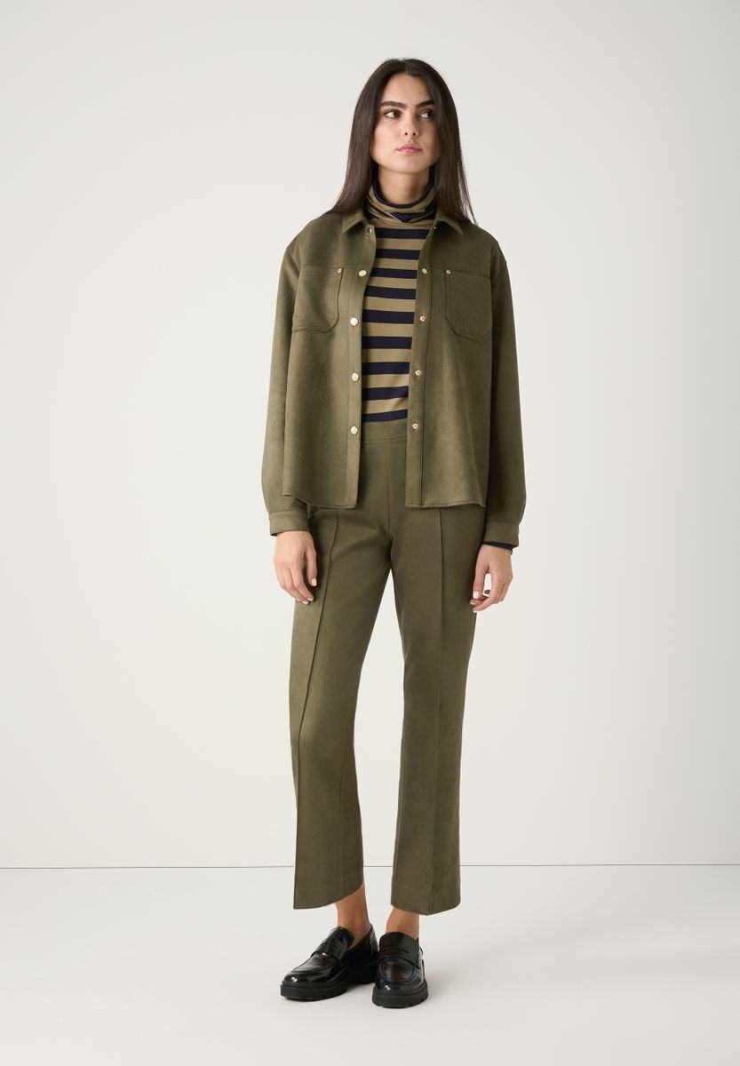 Mit der verkürzten Hose in Wildleder-Optik von MORE & MORE liegen Sie jetzt voll im Trend. Stylen Sie die schmale Hose wahlweise mit lässigem Grobstrickpullover, sportivem Ringelshirt oder femininer Chiffonbluse zu einem angesagten Herbst-Look. FARBNR
