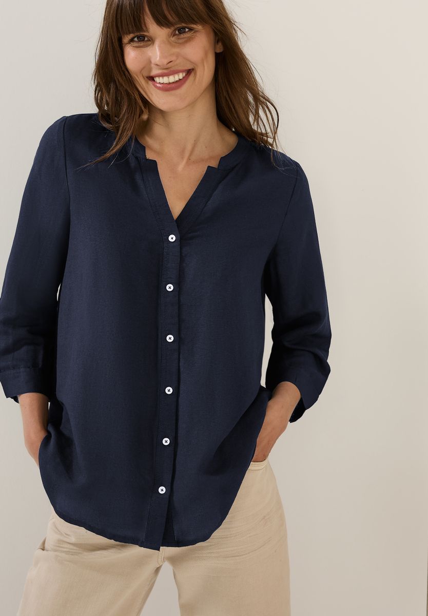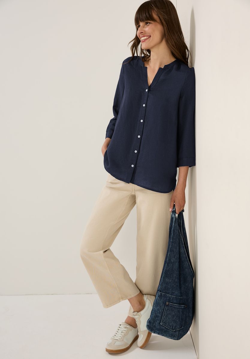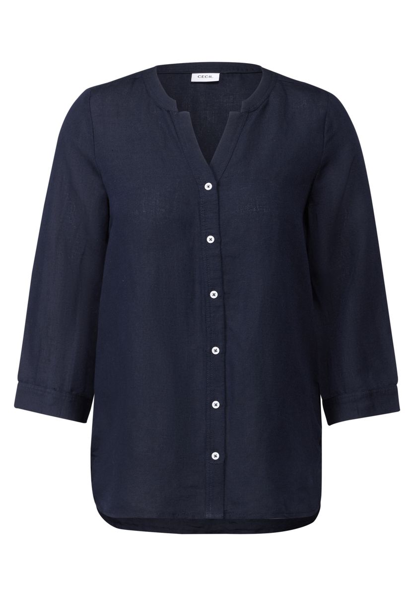 Diese Sommerbluse von CECIL für Damen begeistert mit ihrem geschlitzten Ausschnitt und einer durchgehenden Knopfleiste. Die 3/4-Ärmel mit Bündchen und Knopf unterstreichen den entspannten Look, während der gerundete Saum eine schmeichelhafte Passform bietet. Der angenehme Leinen-Viskosemix macht sie zum perfekten Begleiter für warme Tage. Sommerbluse Split Neck 3/4-Arm mit Bündchen und Knopf Gerundeter Saum Angenehmer Leinen-Viskosemix Material: 55% Leinen, 45% Viskose