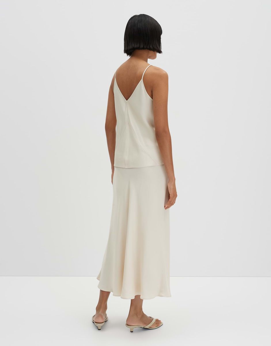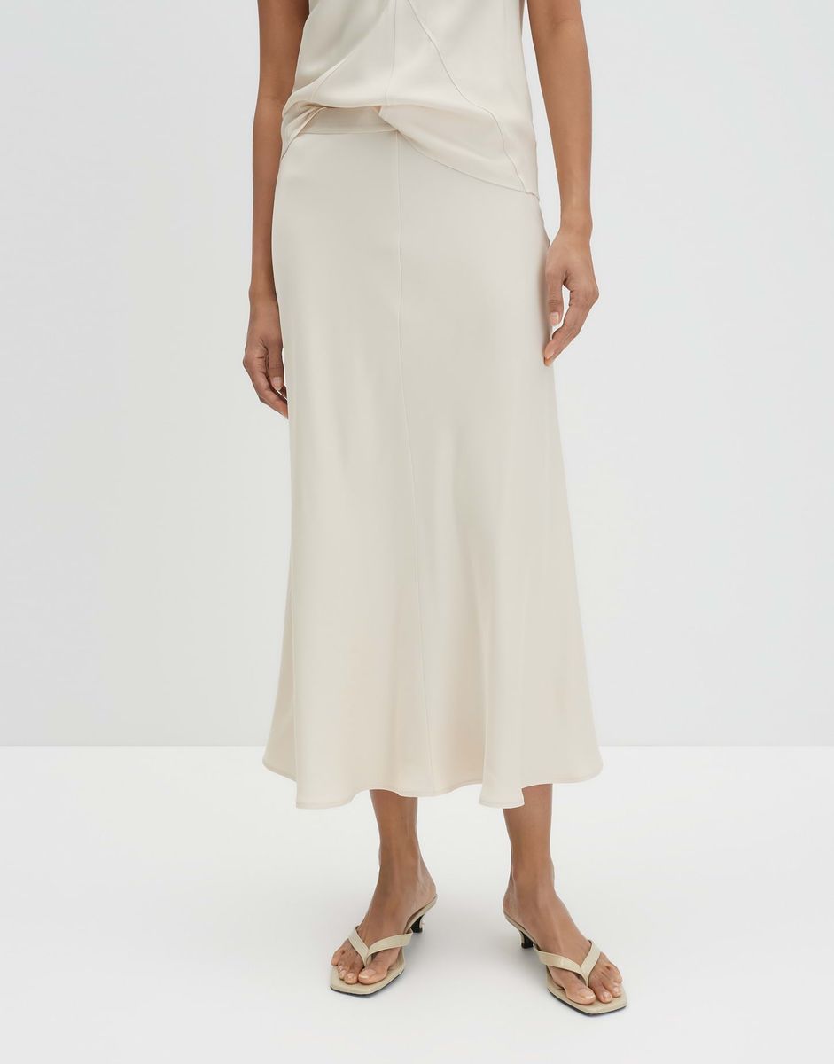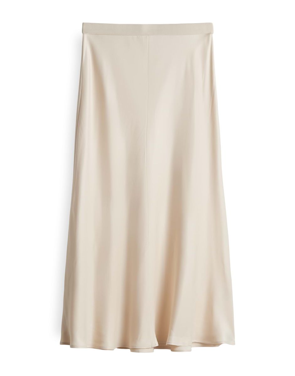 lockere Passform, leicht ausgestellt geschnitten, Midi-Länge, hintere Länge ca. 83 cm in allen Größen, Model Größe 176 cm – trägt Größe 36, Satin, glatter Griff, schimmernde Oberfläche, weich fließender Fall, elastischer Gummibund