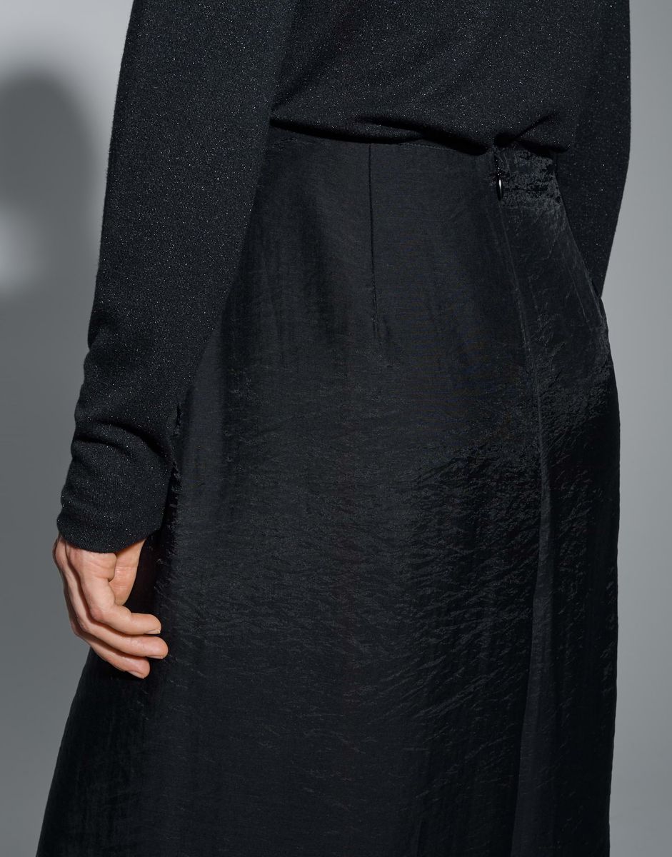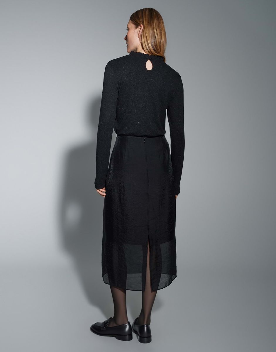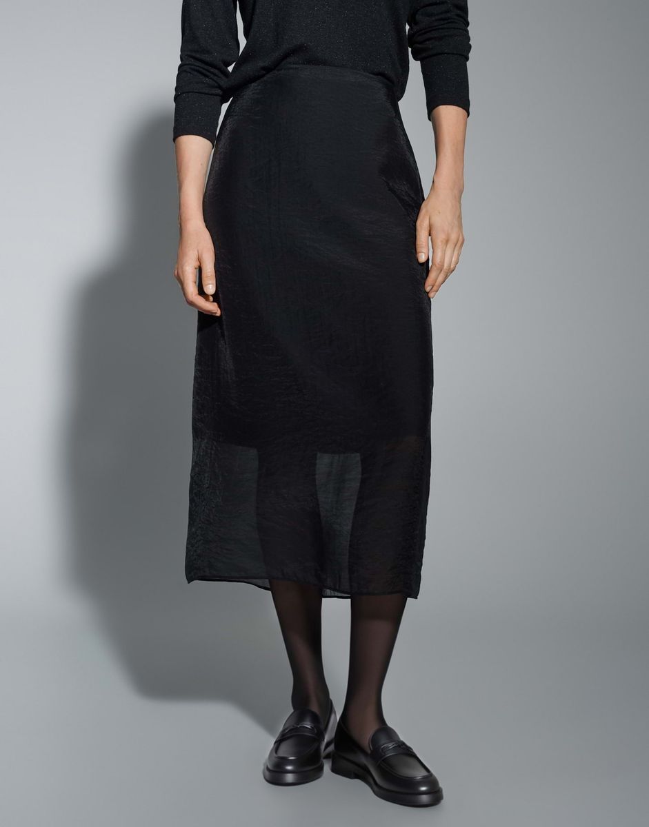 schmale Passform, gerader Schnitt, Midi-Länge, hintere Länge ca. 80 cm in Größe 36, Model Größe 174 cm – trägt Größe 36, glattes Innenfutter, glatter Griff, schimmernde Oberfläche, leichte Transparenz, Chiffon, Webware, Reißverschluss hinten, Rockschlitz hinten, Unterrock, Abnäher am Bund FARBNR