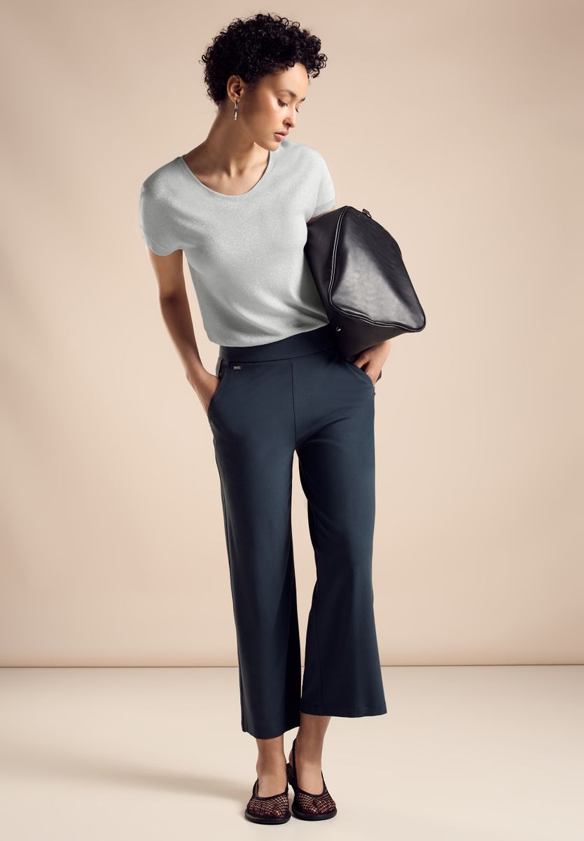Dieses schimmernde Kurzarmshirt für Damen von Street One ist ein stilvolles Damenshirt mit V-Ausschnitt, das deinem Look einen Hauch von Eleganz verleiht. Der angenehme Viskosemix sorgt nicht nur für ein angenehmes Tragegefühl, sondern auch für eine edle Optik. Mit Rippstrick an Arm und Ausschnitt sowie der verlängerten und abgerundeten Rückseite wird das Design perfekt in Szene gesetzt. T-Shirt Kurzarm V-Ausschnitt Schimmer Look Material: 82% Viskose, 10% metallisierte Fasern, 8% Polyamide