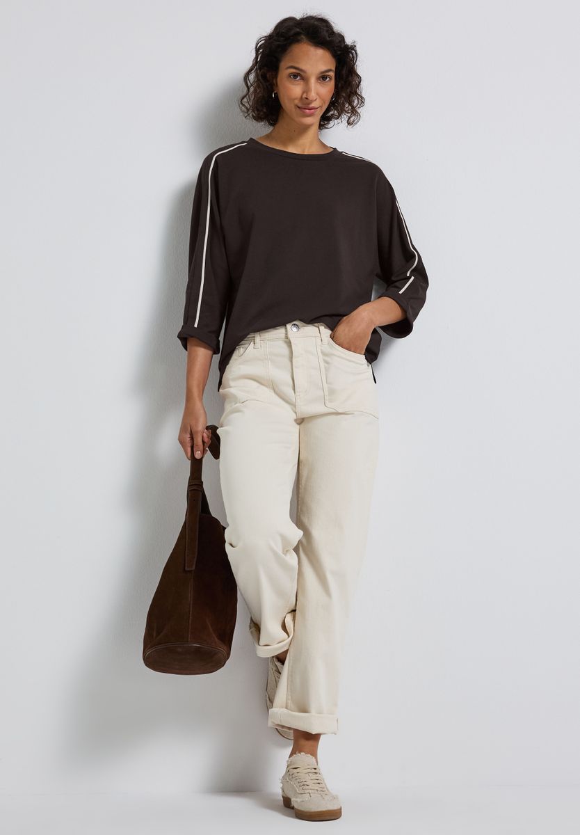 Das Shirt von Street One für Damen kombiniert einen modernen U-Boot-Ausschnitt mit dekorativen Gallonstreifen an den 3/4-Ärmeln. Die weiche Jersey-Qualität aus einem Baumwoll-Modalmix mit Stretchanteil sorgt für ein besonders angenehmes Tragegefühl. Seitliche Schlitze im Saum runden den femininen Look lässig ab. Damenshirt U-Boot-Ausschnitt 3/4-Ärmel mit Dekotape Seitliche Schlitze im Saum Softer Baumwoll-Modalmix mit Stretchanteil Material: 48% Baumwolle, 48% Modal, 4% Elasthan