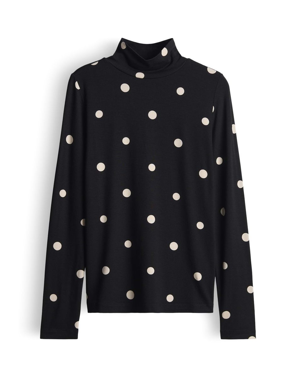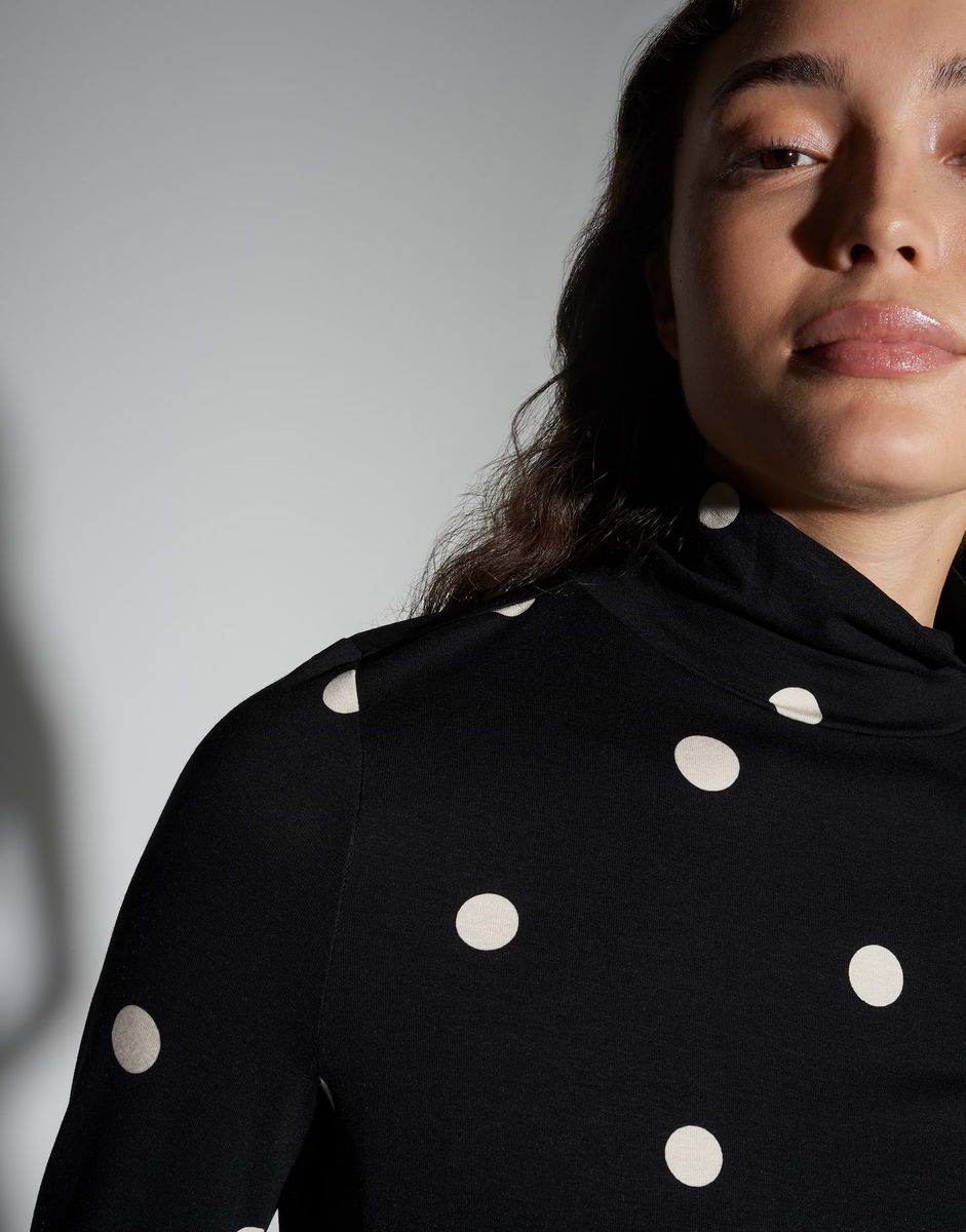 schmale Passform, figurbetont geschnitten, Langarm, Rollkragen, Rückenlänge ca. 60 cm bei Größe 36, Model Größe 177 cm – trägt Größe 36, Jersey, glatter Griff, elastisch, gepunktetes Muster FARBNR