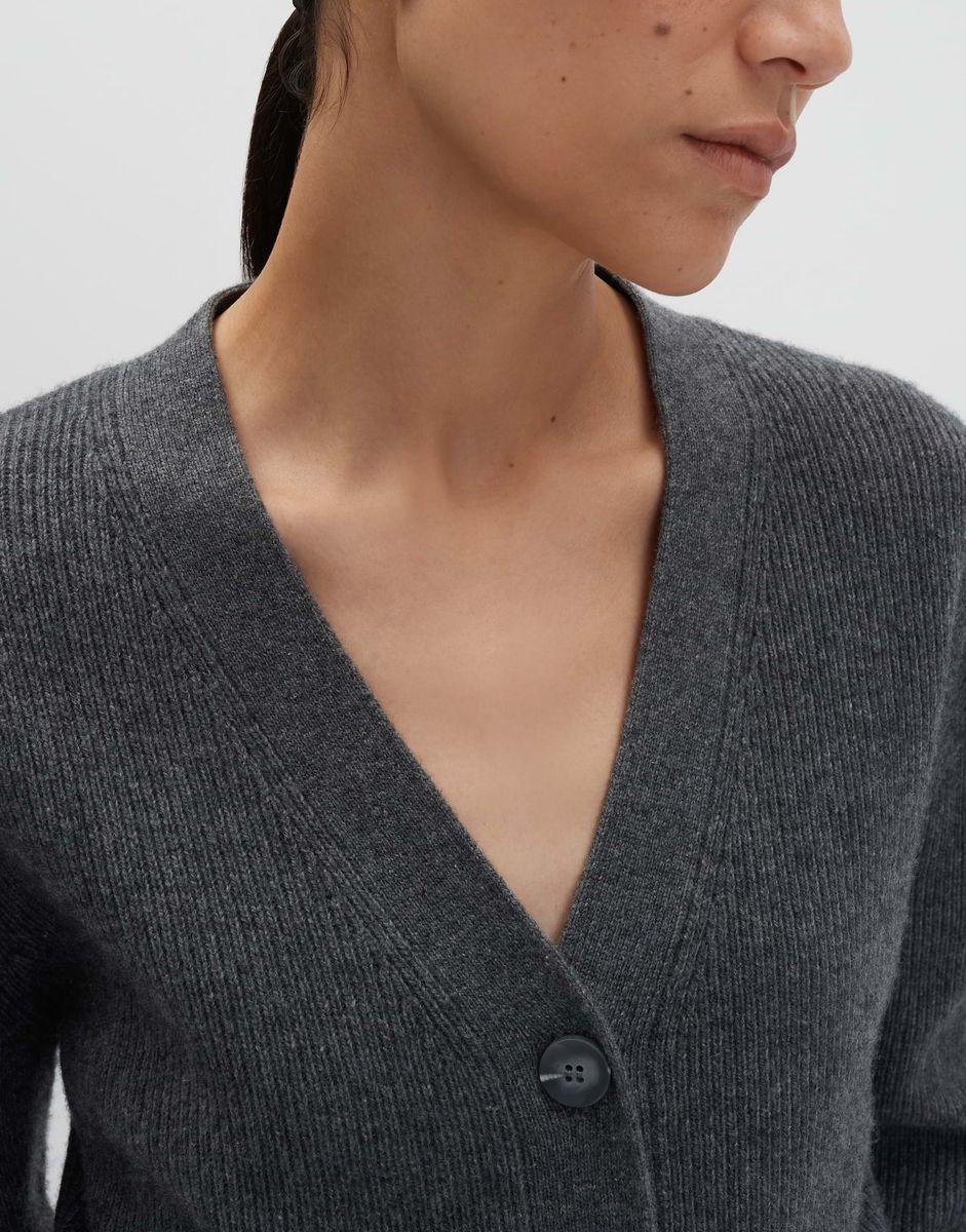 schmale Passform, leicht talliert, Langarm, V-Ausschnitt, Rückenlänge ca. 54 cm bei Größe 36, Model Größe 173 cm – trägt Größe 36, Feinstrick, weicher Griff, wärmend, breiter Ripp-Saum, breite Strickbündchen, Knopfleiste
