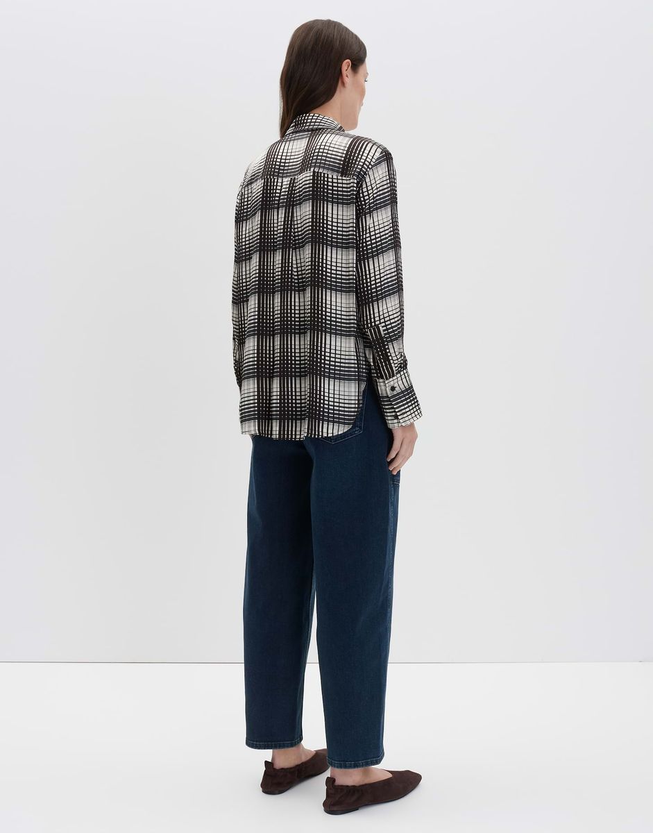 lockere Passform, gerader Schnitt, Long, Langarm, Hemdblusenkragen, Rückenlänge ca. 73 cm bei Größe 36, Model Größe 177 cm – trägt Größe 36, Webware, glatter Griff, schimmernde Oberfläche, Karomuster, abgerundeter Saum, Knopfleiste