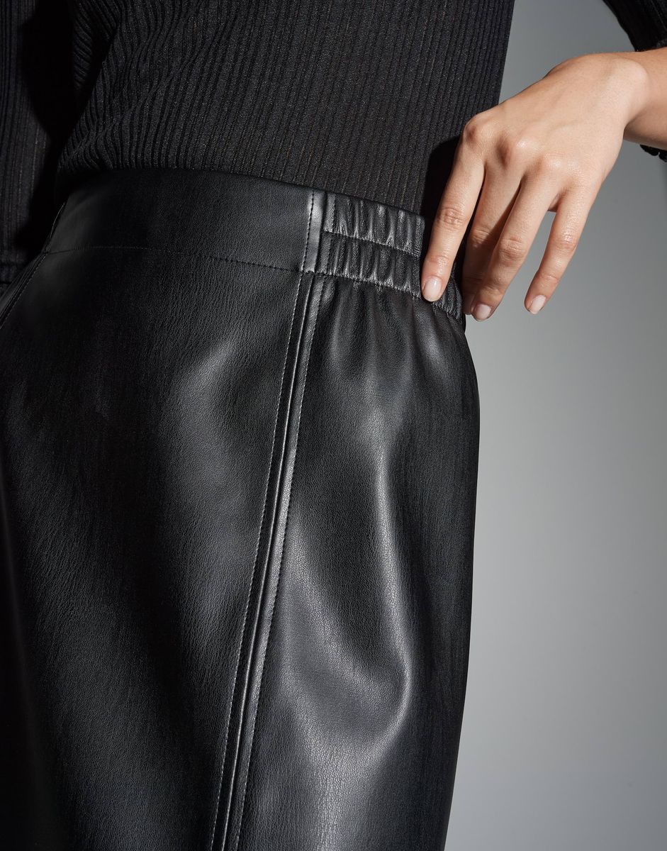 A-Linie, Midi-Länge, hintere Länge ca. 78 cm in Größe 36, Model Größe 177 cm – trägt Größe 36, Lederimitat, ungefüttert, glatter Griff, matter Glanz in der Oberfläche, leicht elastischer Stoff, elastischer Gummibund, Rockschlitz hinten, authentische Teilungsnähte FARBNR
