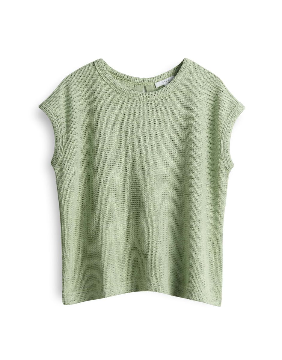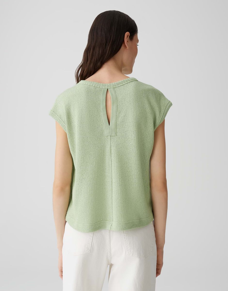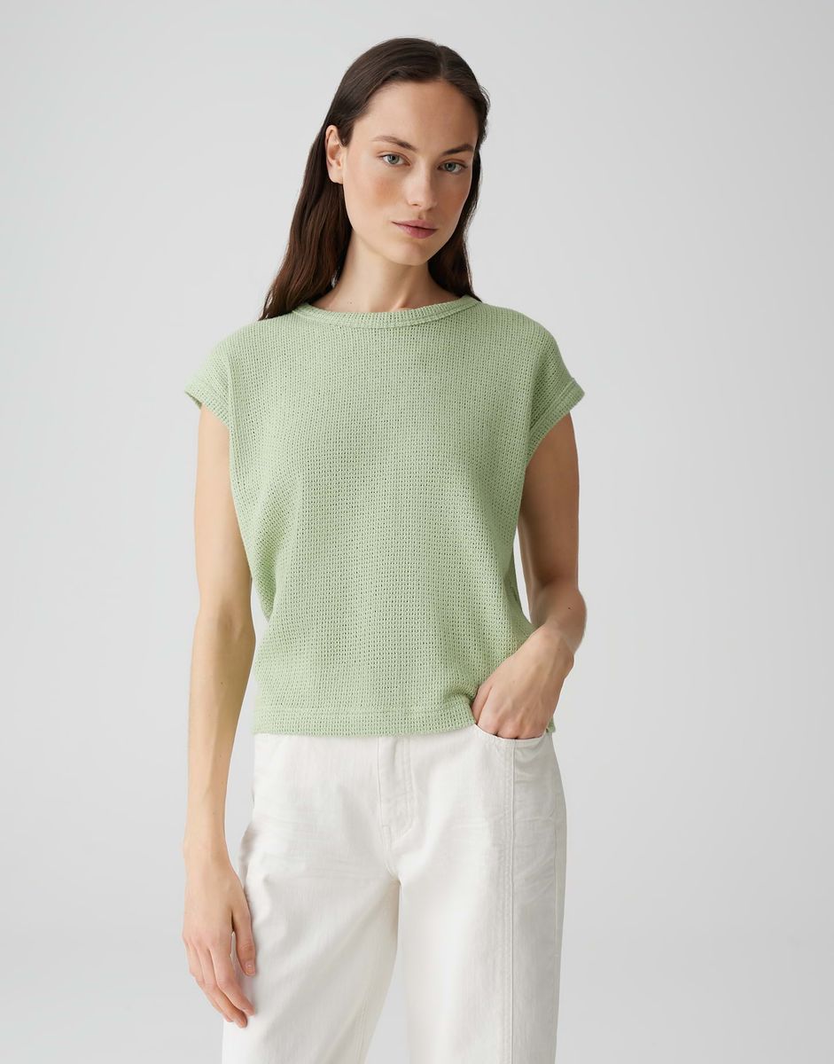 lockere Passform, gerader Schnitt, leicht verkürzt geschnitten, überschnittener Kurzarm, Rundhalsausschnitt, Rückenlänge ca. 54 cm bei Größe 36, Model Größe 177 cm – trägt Größe 36, Jersey, strukturierte Oberfläche, fester Griff, leichte Transparenz, Schlitz unterhalb vom hinteren Halsloch