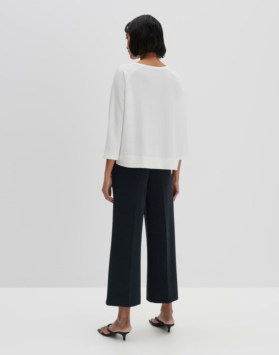 lockere Passform, gerader Schnitt, leicht verkürzt geschnitten, Fledermausärmel in 3/4 Länge, Rundhalsausschnitt, Rückenlänge ca. 55 cm in Größe 36, Model Größe 177 cm – trägt Größe 36, Jersey, Streifenstruktur, weicher Griff, elastischer Stoff, kleine Schlitze in den Seiten