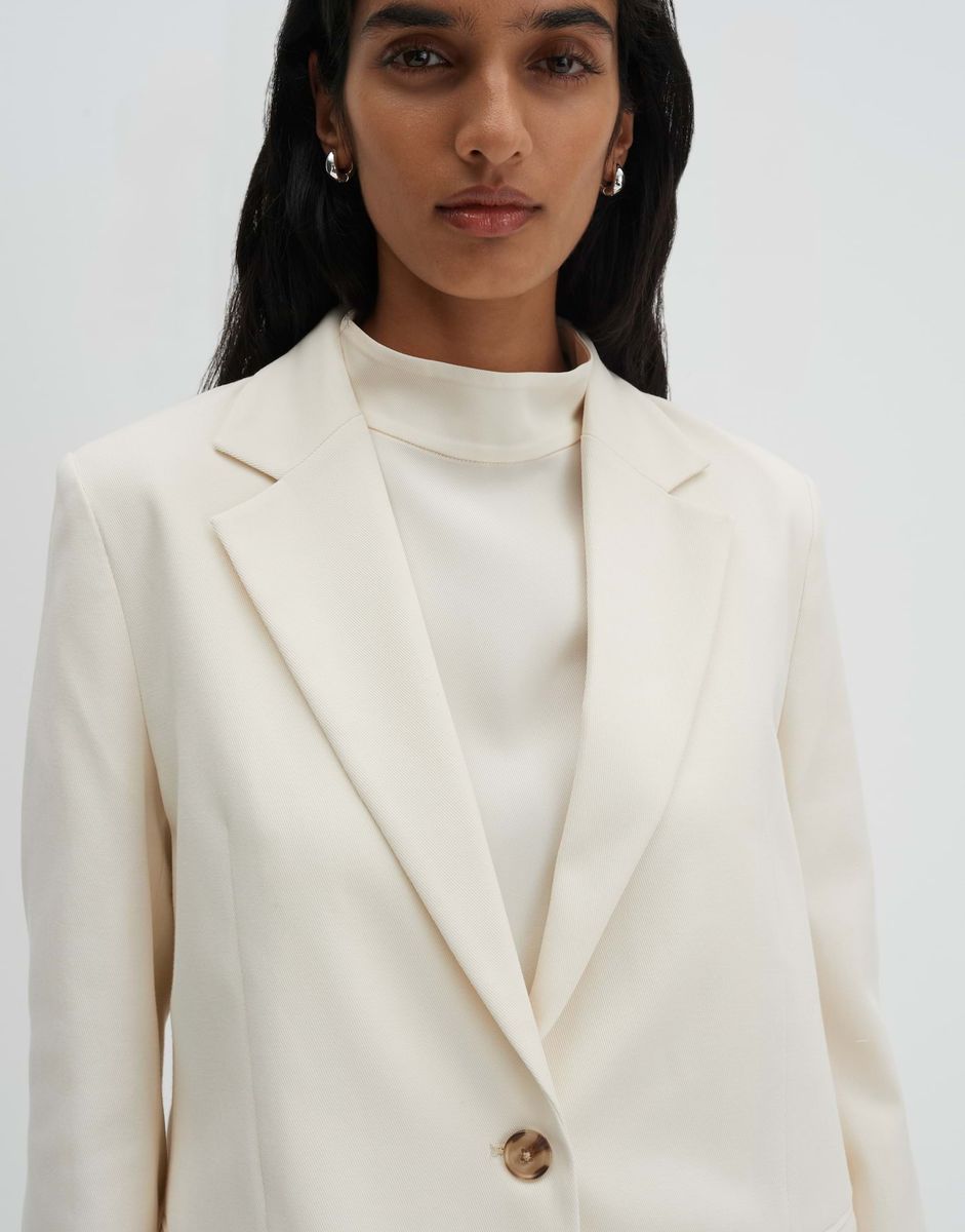lockere Passform, leicht tailliert, lang geschnitten, Langarm, Reverskragen, Rückenlänge ca. 69 cm bei Größe 36, Model Größe 173 cm – trägt Größe 36, Webware, glattes Innenfutter, dezente Twillstruktur, fester Griff, Pattentaschen, Ein-Knopf-Verschluss, Gehschlitz, Schlitz am Ärmelsaum FARBNR