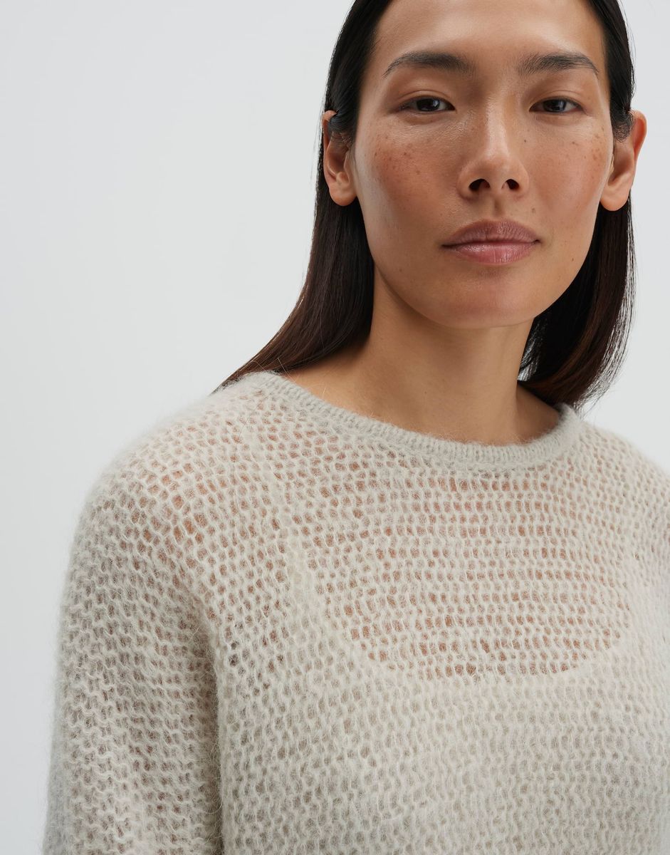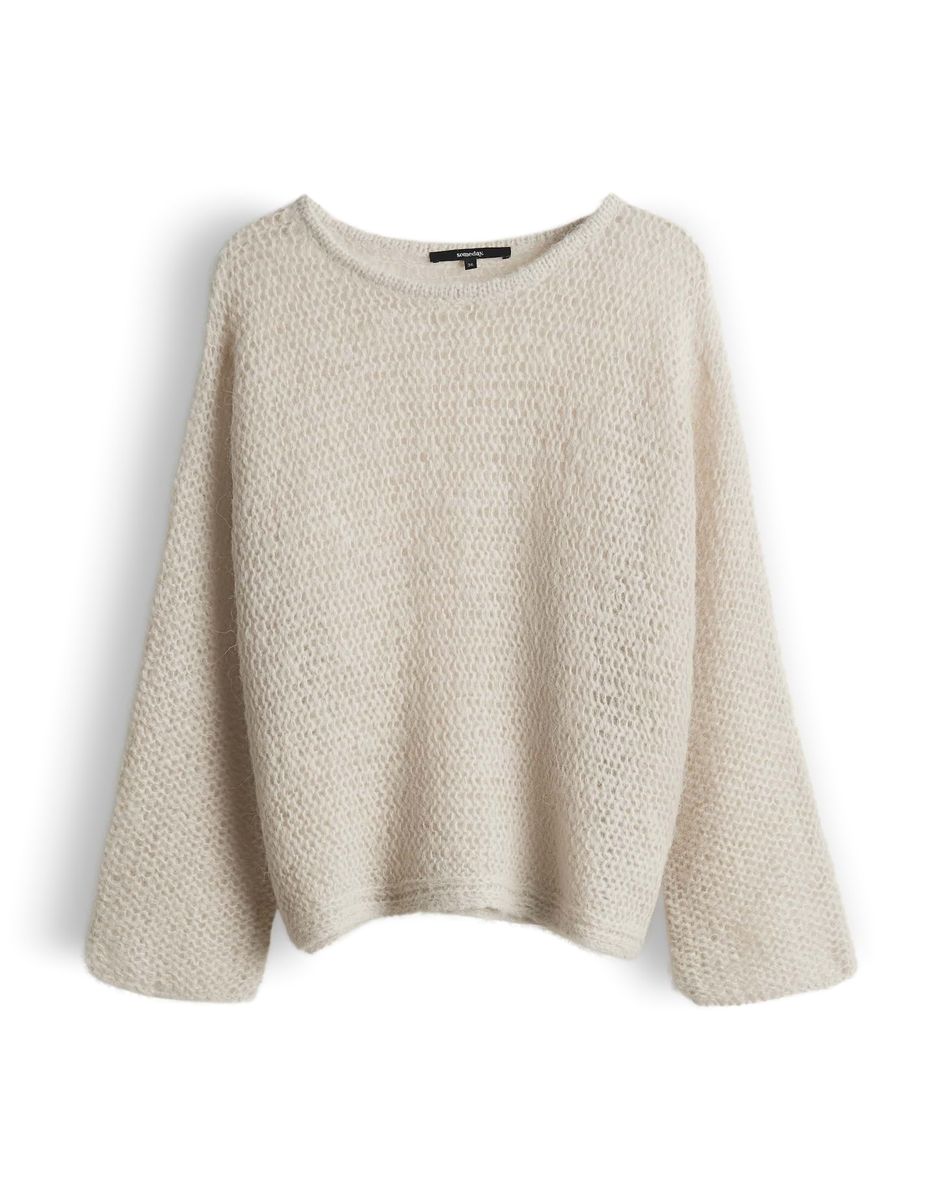weite Passform, schmal zulaufend, verkürzte Länge, verkürzter Fledermausärmel, U-Boot-Ausschnitt, Rückenlänge ca. 50 cm bei Größe 36, Model Größe 176 cm – trägt Größe 36, Strick, weicher Griff, leichte Transparenz, Lochstrickmuster FARBNR