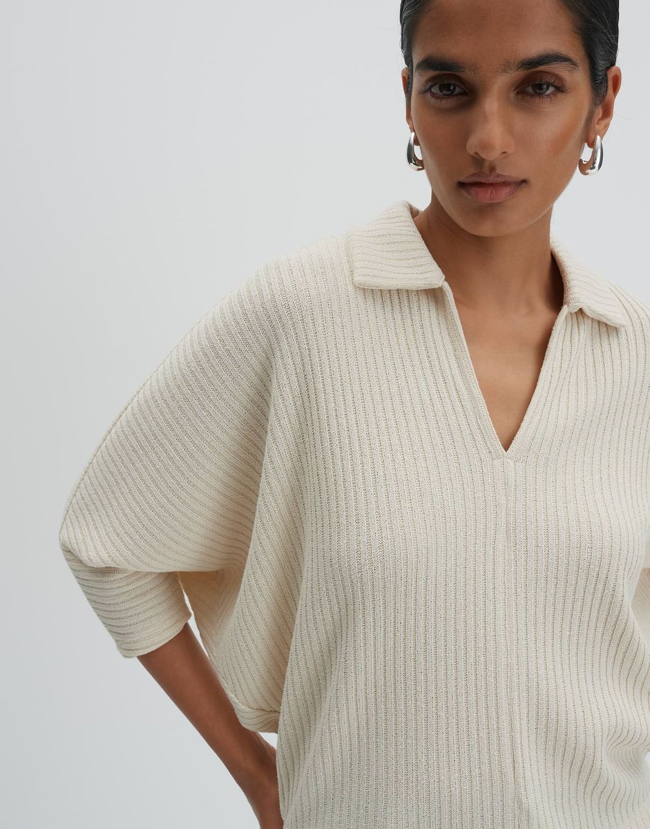 weite Passform, oversized, überschnittener 3/4 Arm, V-Ausschnitt, Polokragen, Rückenlänge ca. 54 cm bei Größe 36, Model Größe 175 cm – trägt Größe 36, Sweatware, Rippstruktur, weicher Griff, elastisch, Fledermausärmel FARBNR