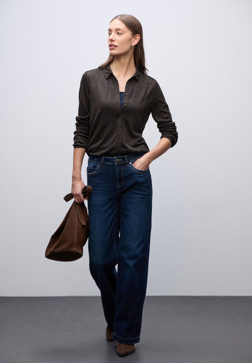 Das Tunika-Shirt von Street One für Damen kombiniert einen klassischen Hemdkragen mit verspieltem Leo-Print. Die Knopfleiste, der Tunnelzug am Saum und die elastischen Bündchen verleihen dem Shirt eine lässige Passform. Die softe Jersey-Qualität mit Modal-Anteil bietet dir ein rundum angenehmes Tragegefühl. Jerseyshirt mit Knopfleiste Hemdkragen Langarm mit elastischen Bündchen Tunnelzug am Saum Softer Baumwoll-Modalmix Material: 50% Baumwolle, 50% Modal FARBNR
